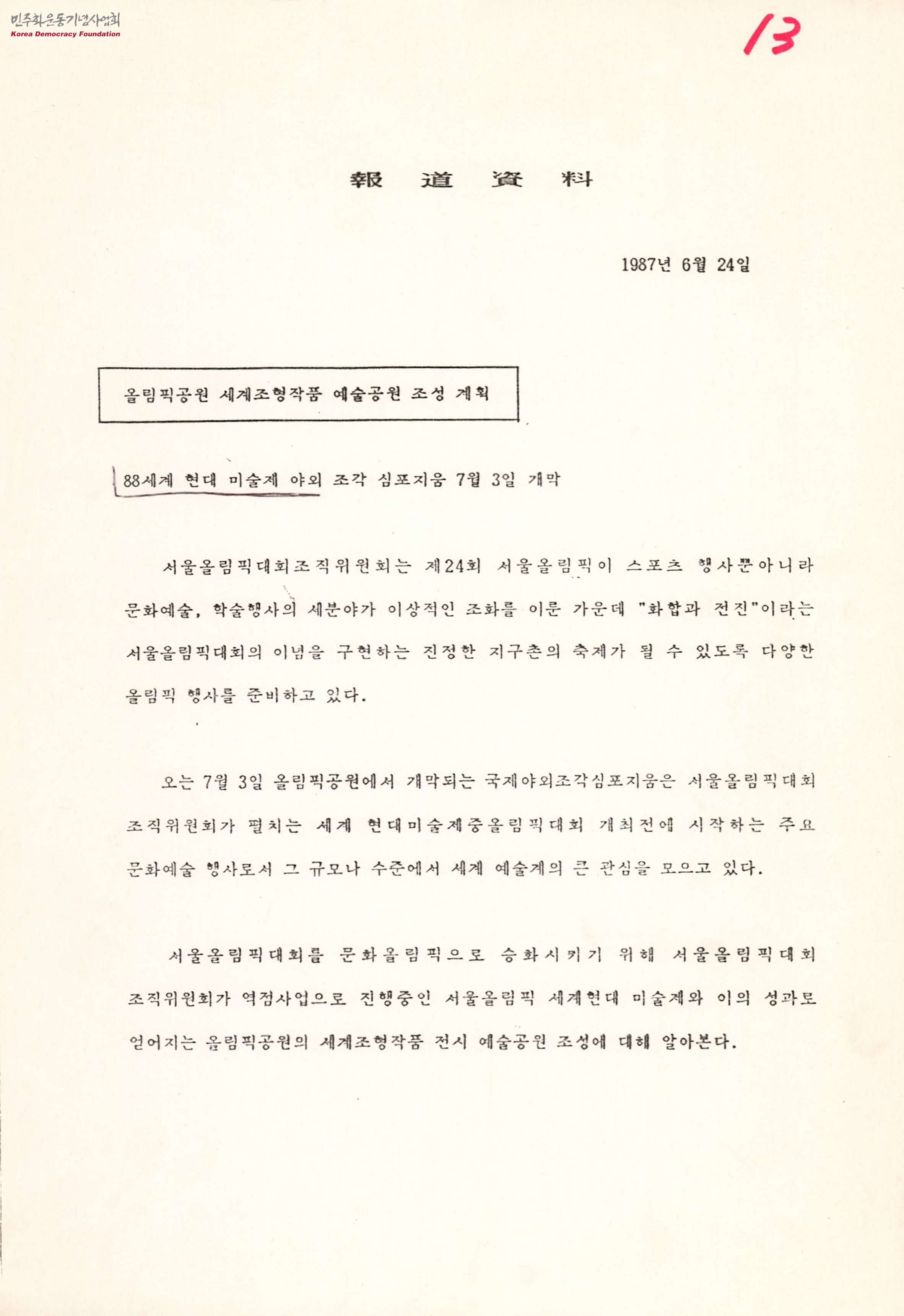 - 서울올림픽대회조직위원회는 제24회 서울올림픽대회를 계기로 각국의 대표적 예술 작품을 서울에 유치, 전시하는 것을 목적으로 올림픽 공원을 조성할 계획이며, 문화예술 행사의 일부로서 세계현대미술제를 개최하여 작가들을 초청해 야외조각 심포지움, 세계야외조각 초대전, 세계현대회화전 등 세계적인 수준의 조형작품을 반입 및 제작할 계획이라는 사실을 보도해 줄 것을 요청하는 내용의 글
