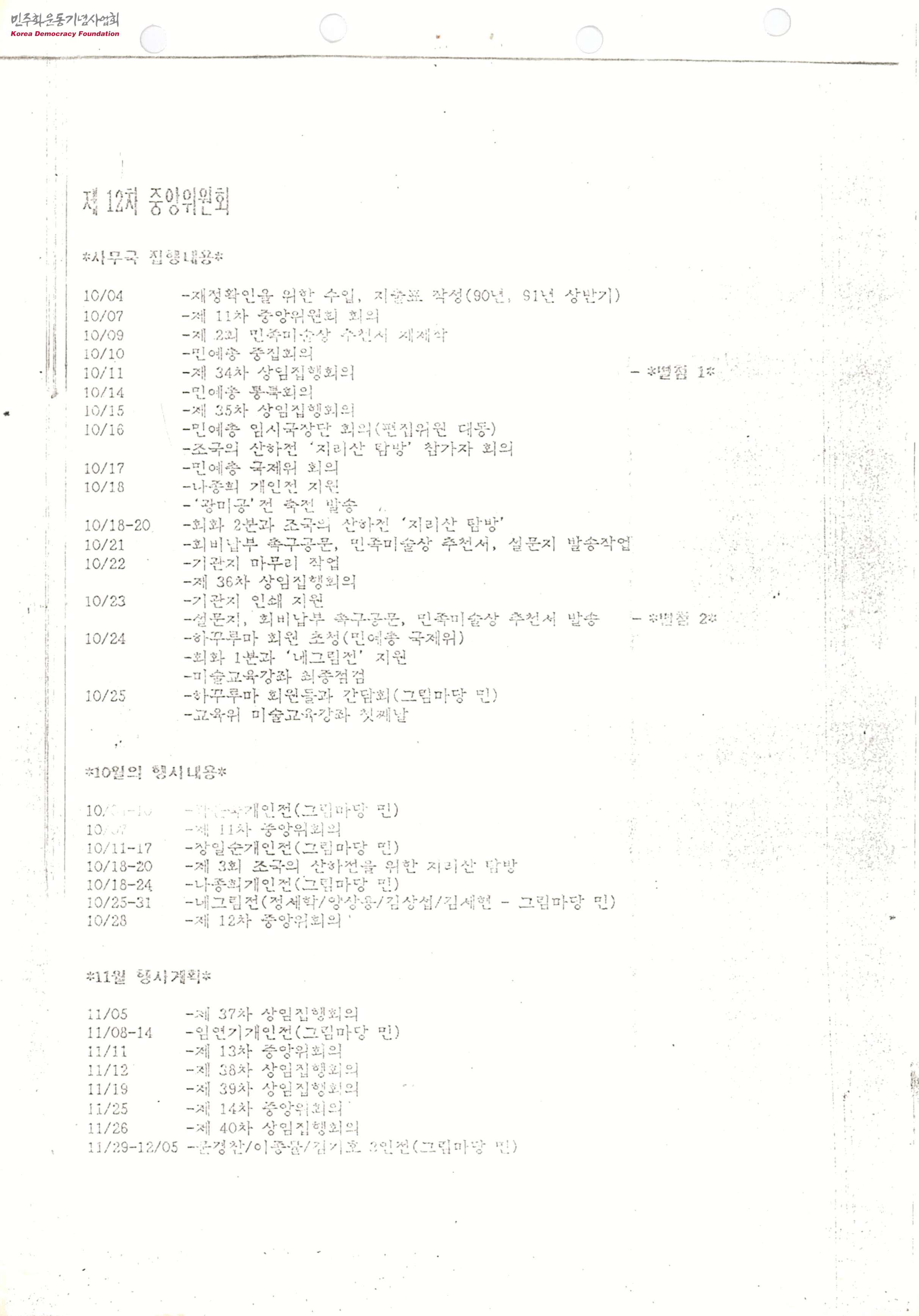 - 1991년 11월에 진행한 제12차 중앙위원회 회의록으로, 사무국보고, 아라꾸사 미술전 초청 일본방문 보고, 대구 민족미술인협의회 창립 경과 보고 등 3개의 보고 내용과 총준위 결정 사항에 대한 안내를 중심으로 진행되었으며, 보고와 안내의 내용을 설명하기 위한 별첨 문서들이 포함되어 있음