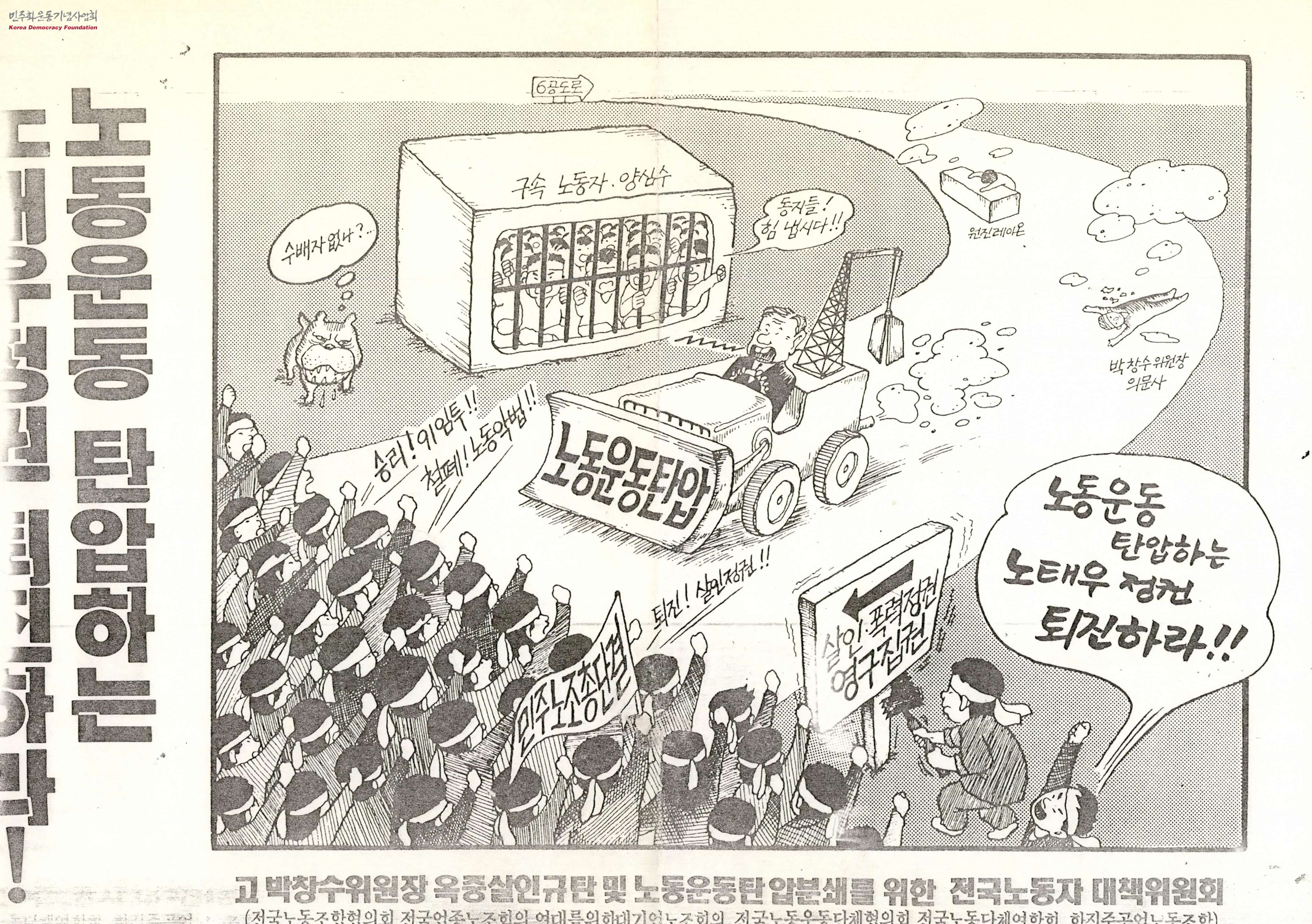 - 노동운동탄압'이라고 쓰인 불도저를 탄 노태우가 노동운동가들을 밀어버리려 돌진하는 모습을 그려낸 만평과 함께 노태우 정권 퇴진을 외치는 내용의 리플릿