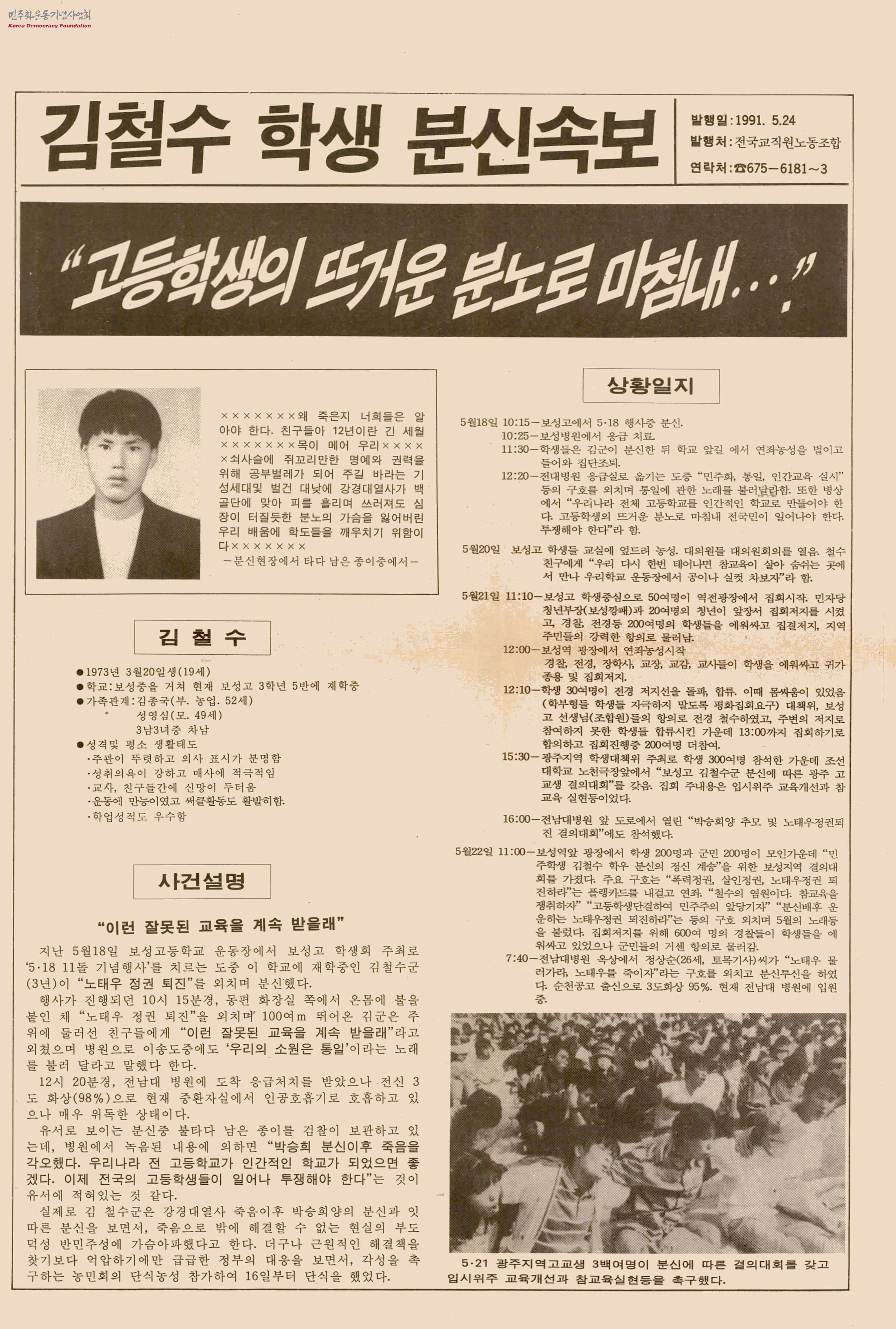 - 1991년 5월 18일 보성고등학교 운동장에서 보성고 학생회 주최로 5.18 11돌 기념행사를 치르는 도중 이 학교에 재학중인 김철수군이 '노태우 정권 퇴진'을 외치며 분신하였는데, 그의 유서에는 '우리나라 전 고등학교가 인간적인 학교가 되었으면 좋겠다. 이제 전국의 고등학생들이 일어나 투쟁해야 한다'고 적혀있었다는 내용의 속보