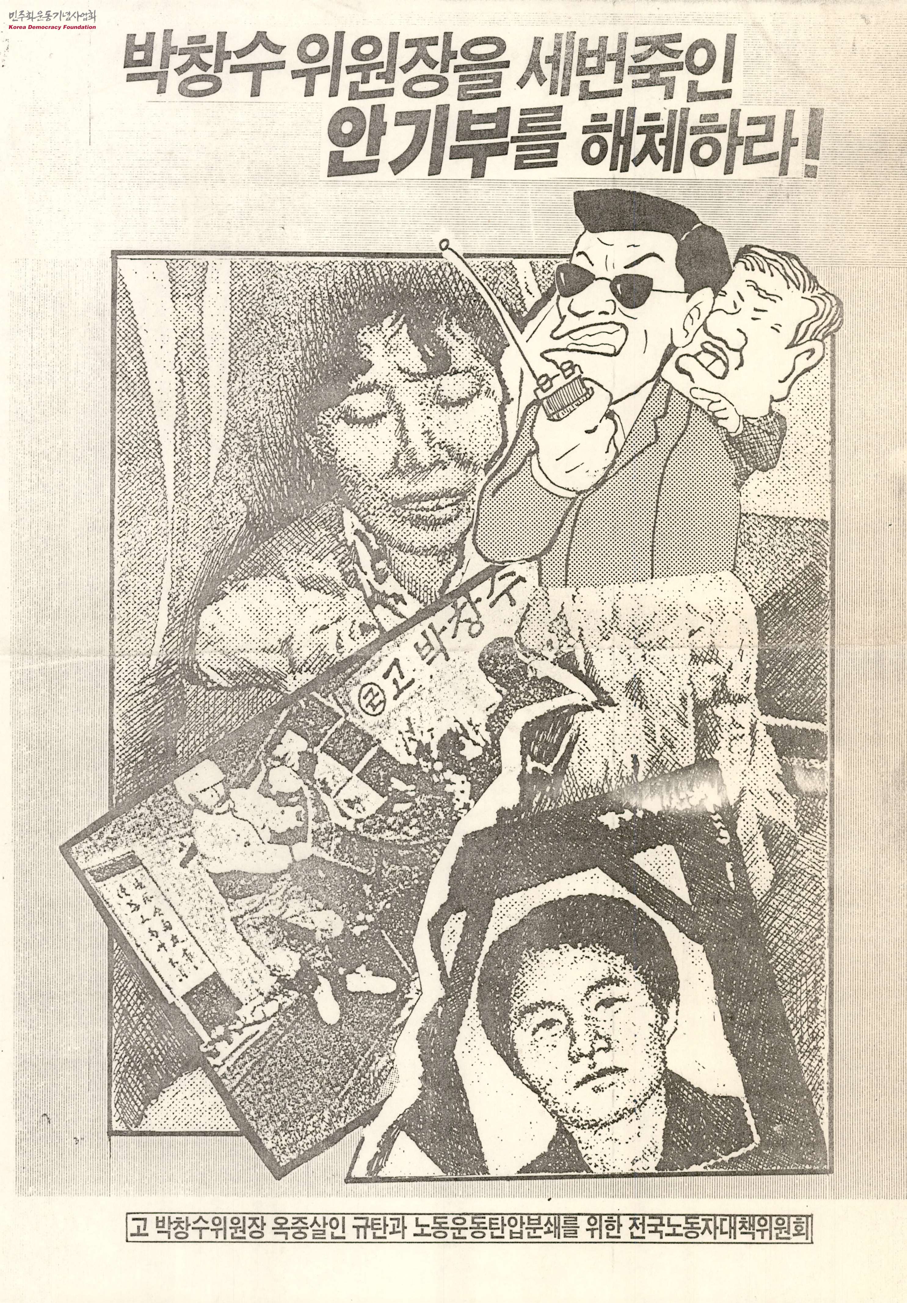 - 안양병원에서 의문사한 한진중공업 노조위원장 박창수씨의 영정사진, 백골단의 장례식장 무단 침입 및 시신 탈취, 선글라스를 끼고 무전기를 들고 있는 사내 뒤에서 지시를 하는 노태우 전 대통령의 모습 등을 그린 만평과 함께 안기부 해체를 주장하는 내용의 전단