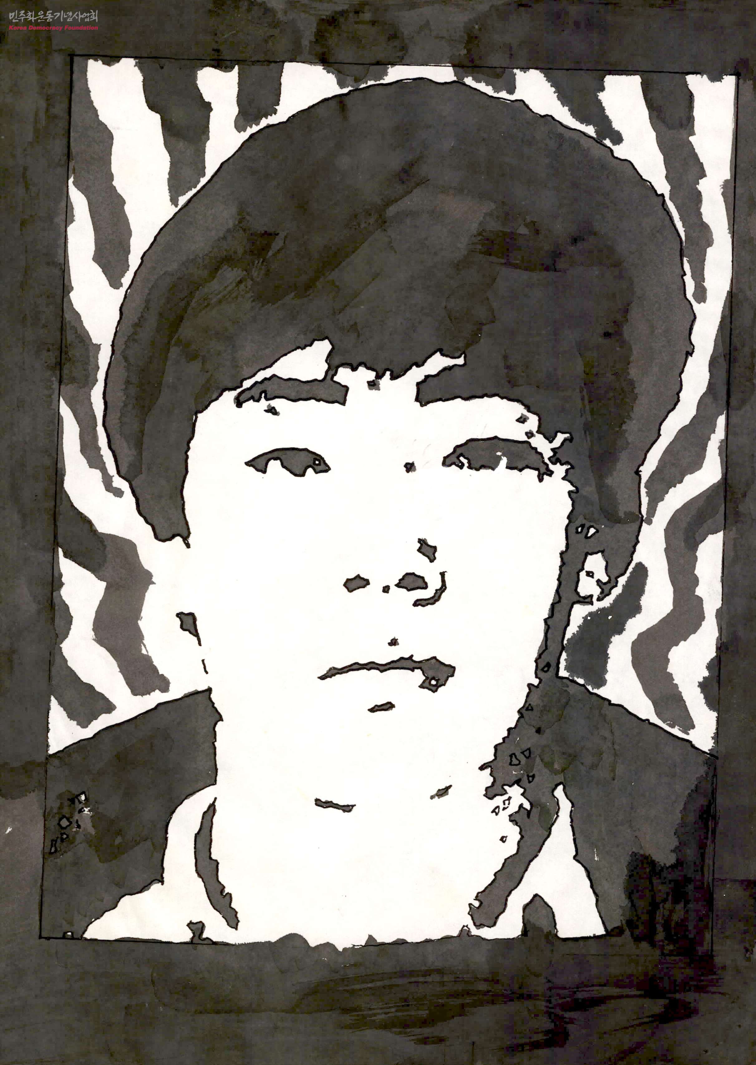 - 1991년 5월 1일 안동대학교 학생 고 김영균 열사는 교내 민주광장에서 학생 3백여 명이 참가한 가운데 강경대 열사 추모식 및 폭력 공안정권 규탄대회를 열고 있던 도중 명지대생 강경대 열사 타살 사건에 항의하는 마음으로 온 몸에 신나를 끼얹고 분신자살을 하였음. 이 그림은 고 김영균 열사의 모습이 담긴 목판화임