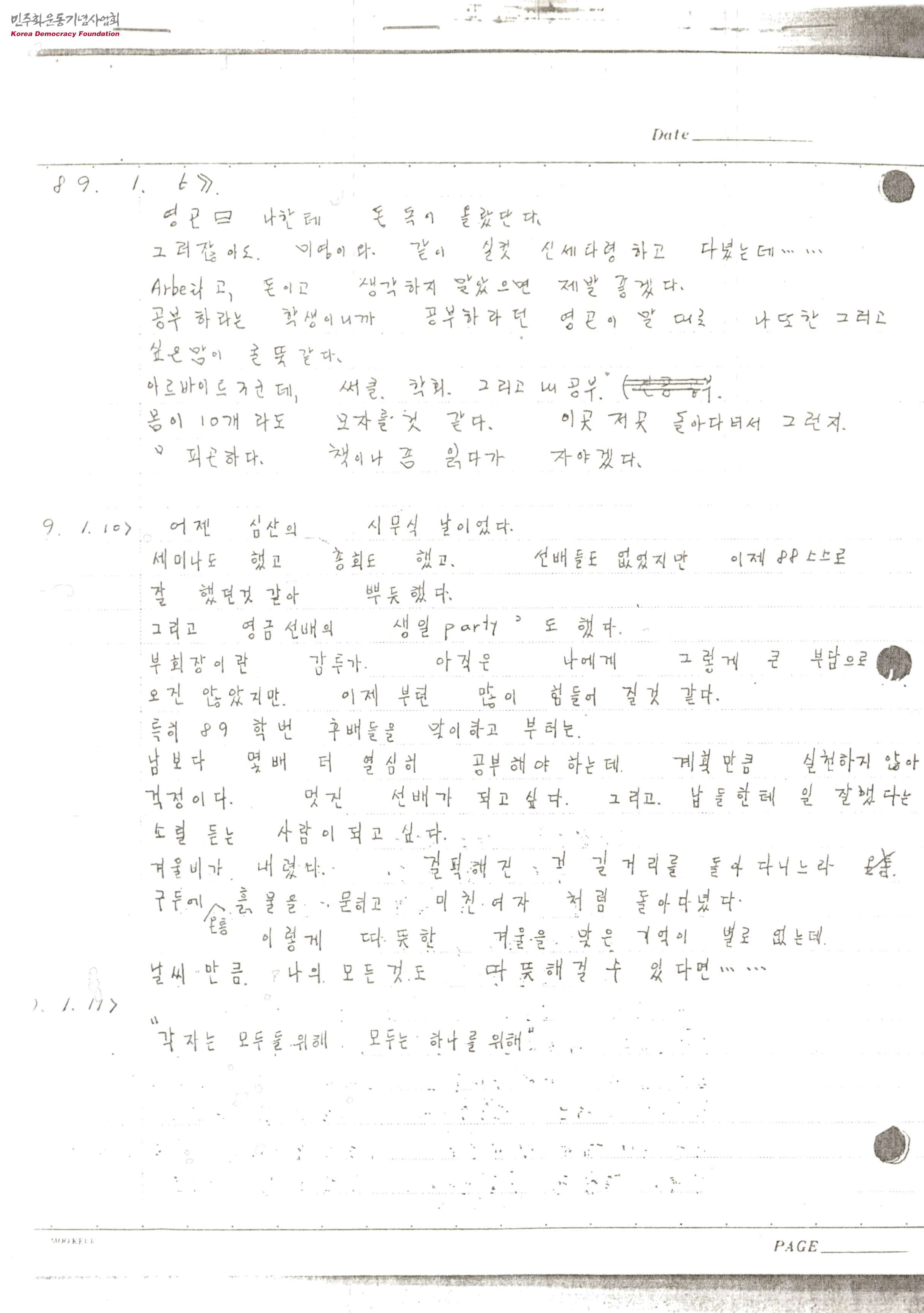 - 김귀정 열사는 생전 학교 공부, 학회 공부 및 활동, 아르바이트, 써클 활동 등 모든 면에 열심히 하던 학생이었고, 특히 심산연구회 활동이 그녀 인생에서 자주, 민주, 통일 등의 가치관을 심어주었음을 알 수 있으며, 1990년부터는 이러한 가치관을 실제로 실천하기 위해 직접 집회 활동을 했었음을 알 수 있는 김귀정 열사의 일기로 추정