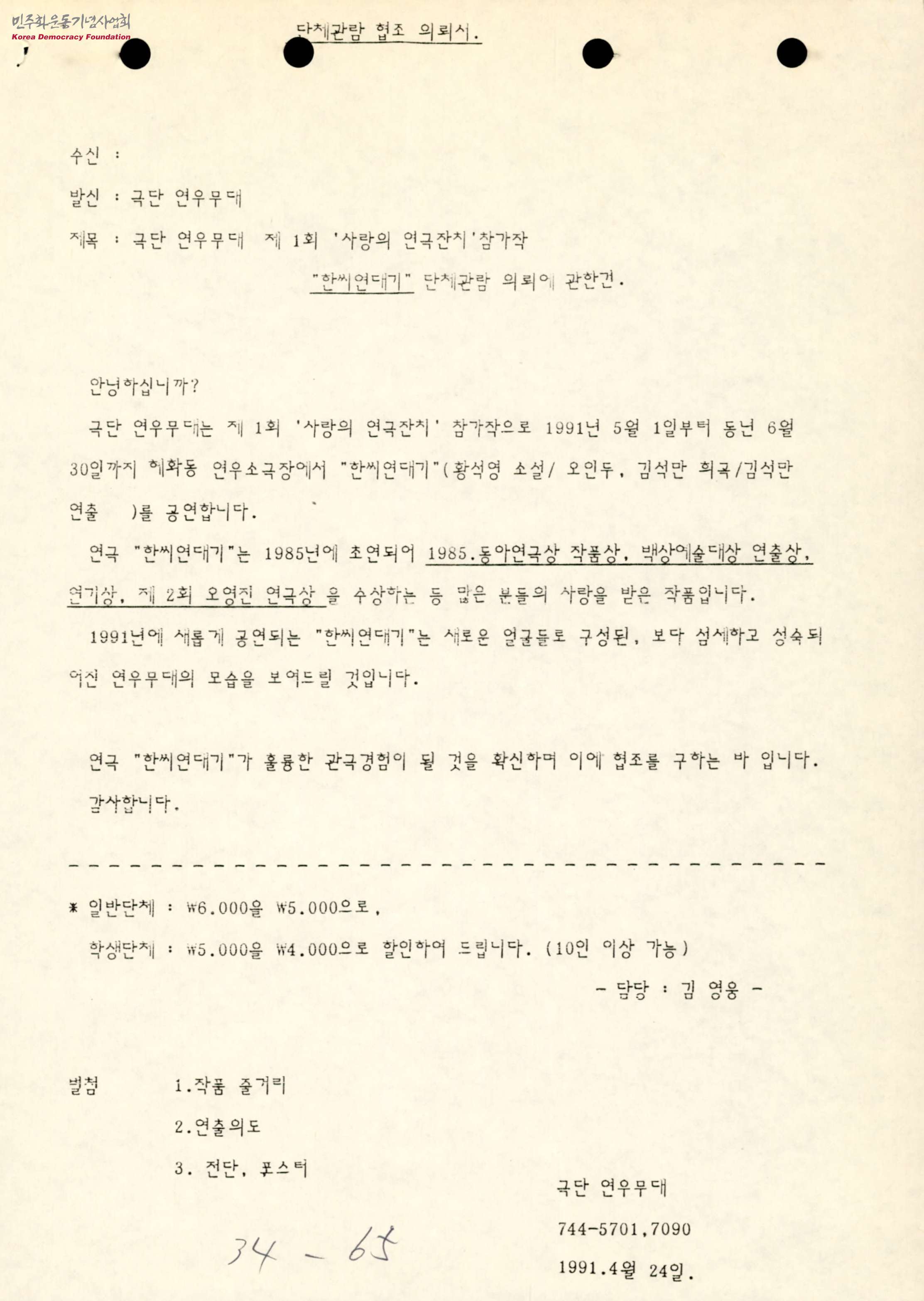 - 극단 연우무대에서 제1회 '사랑의 연극잔치' 참가작으로 1991년 5월 1일부터 6월 30일까지 혜화동 연우소극장에서 '한씨연대기'를 공연하는 것에 대한 협조요청 문서로, 해당 협조는 일반단체를 6000원에서 5000원으로, 학생단체는 5000원에서 4000원으로 할인한다는 내용임