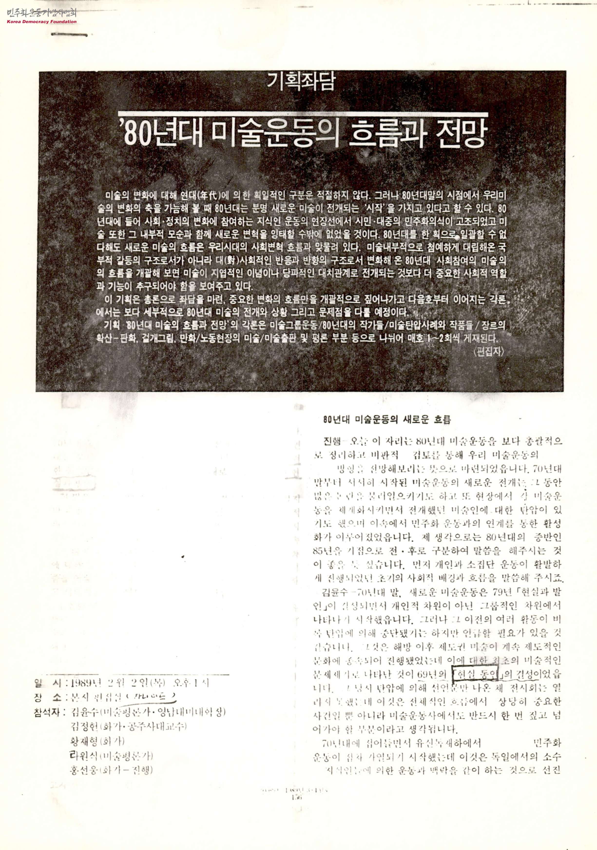- 1989년 2월 2일 가나아트 본사 편집실에서 김윤수, 김정헌, 황재형 등 5명이 참석하여 80년대 미술운동의 흐름과 전망에 대한 의견을 나눈 좌담회의록으로, 본 회의는 80년대 새로운 미술의 흐름이 사회참여적으로 변함으로 인한 당시 미술의 전개와 상황 그리고 문제점에 대한 내용을 담고 있음