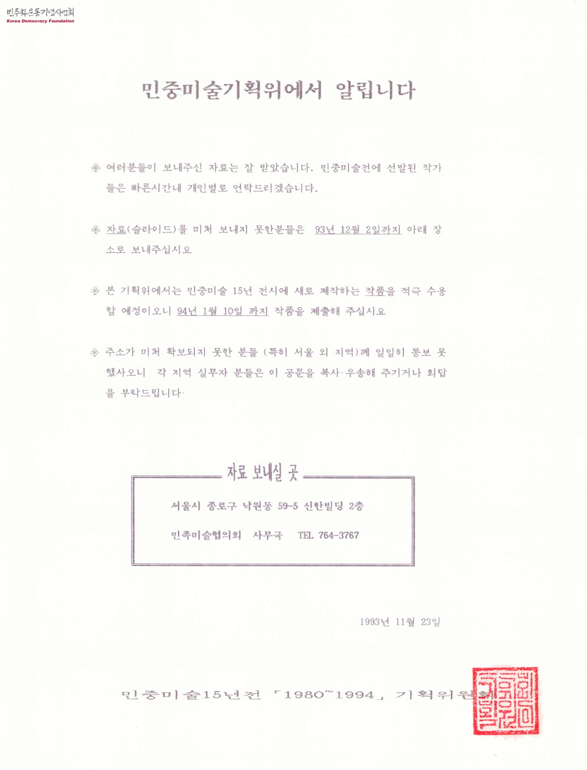 - 민중미술전에 선발된 작가들에게는 개별적으로 빠른 시일 내에 연락을 주겠다는 내용, 자료(슬라이드)를 보내지 못한 분들은 1993년 12월 2일까지 보내 주길 바란다는 내용, 이번 전시에 새로 제작하는 작품을 적극 수용할 예정이니 완성 작품은 1994년 1월 10일까지 제출해 주기를 바란다는 내용, 주소가 확보되지 못한 분들께는 일일이 통보가 불가능하니 각 지역 실무자들은 이 공문을 복사하여 우송해 줄 것을 부탁한다는 내용 등이 담긴 문서