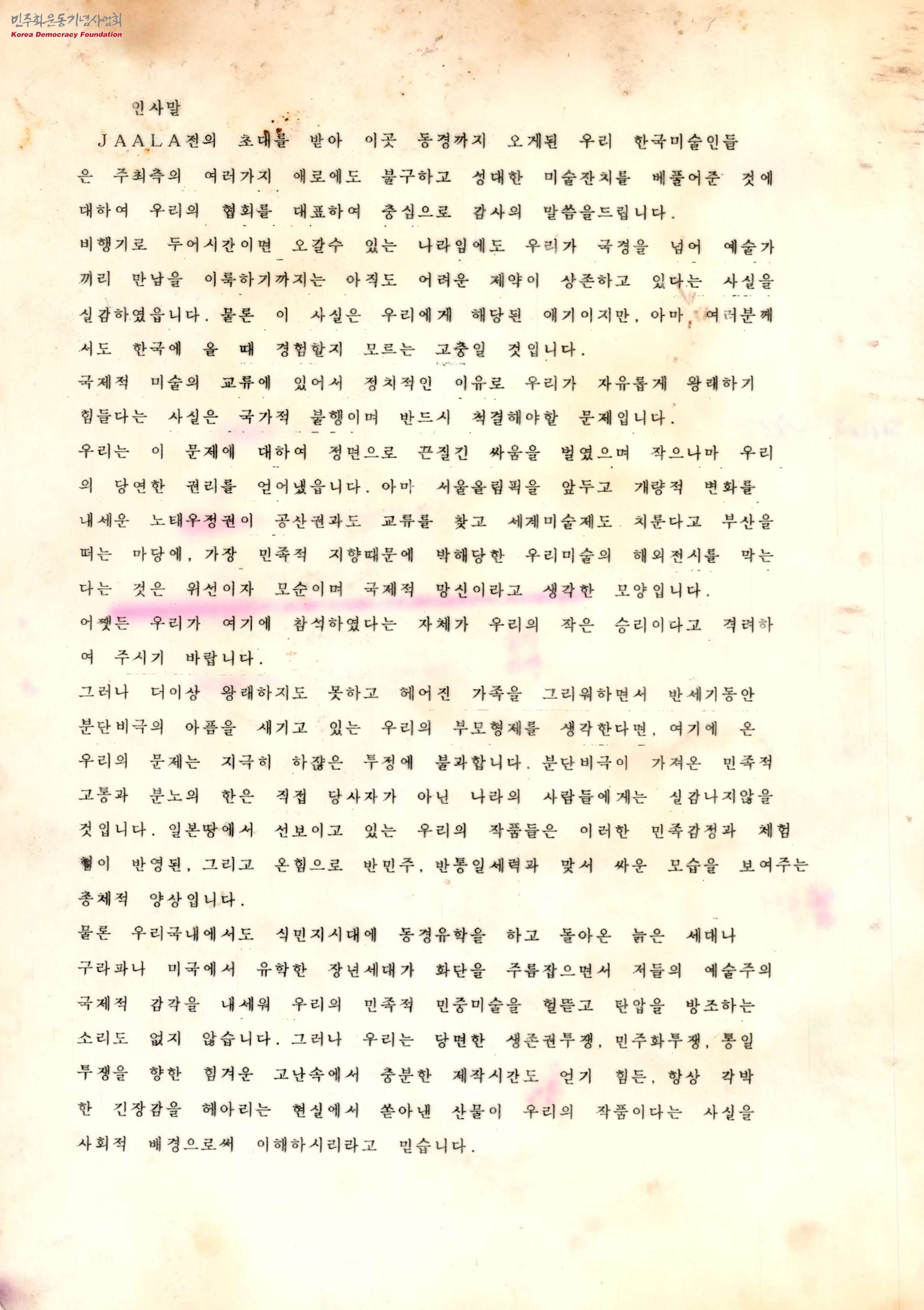 - 민족미술협의회의에서 작가들에게 2번째 참가하는 JAALA전에 대한 문서로, 민중미술과 관련된 현 정권과의 갈등과 함께 JAALA의 취지를 알리며 참여를 바라는 내용이 담겨 있음