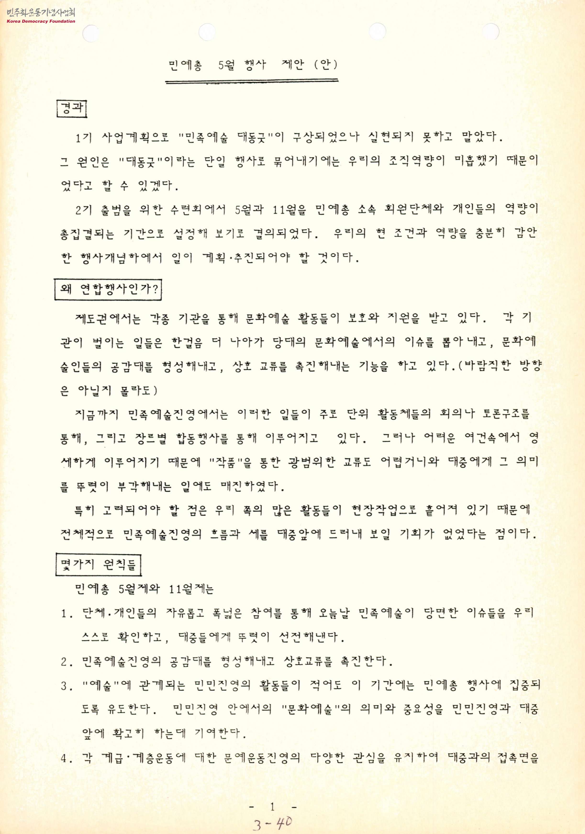 - 민예총 5월행사를 여러 단체들에게 제안한 문서로, 행사의 취지와 원칙들, 컨셉 등의 정보가 담겨 있음
