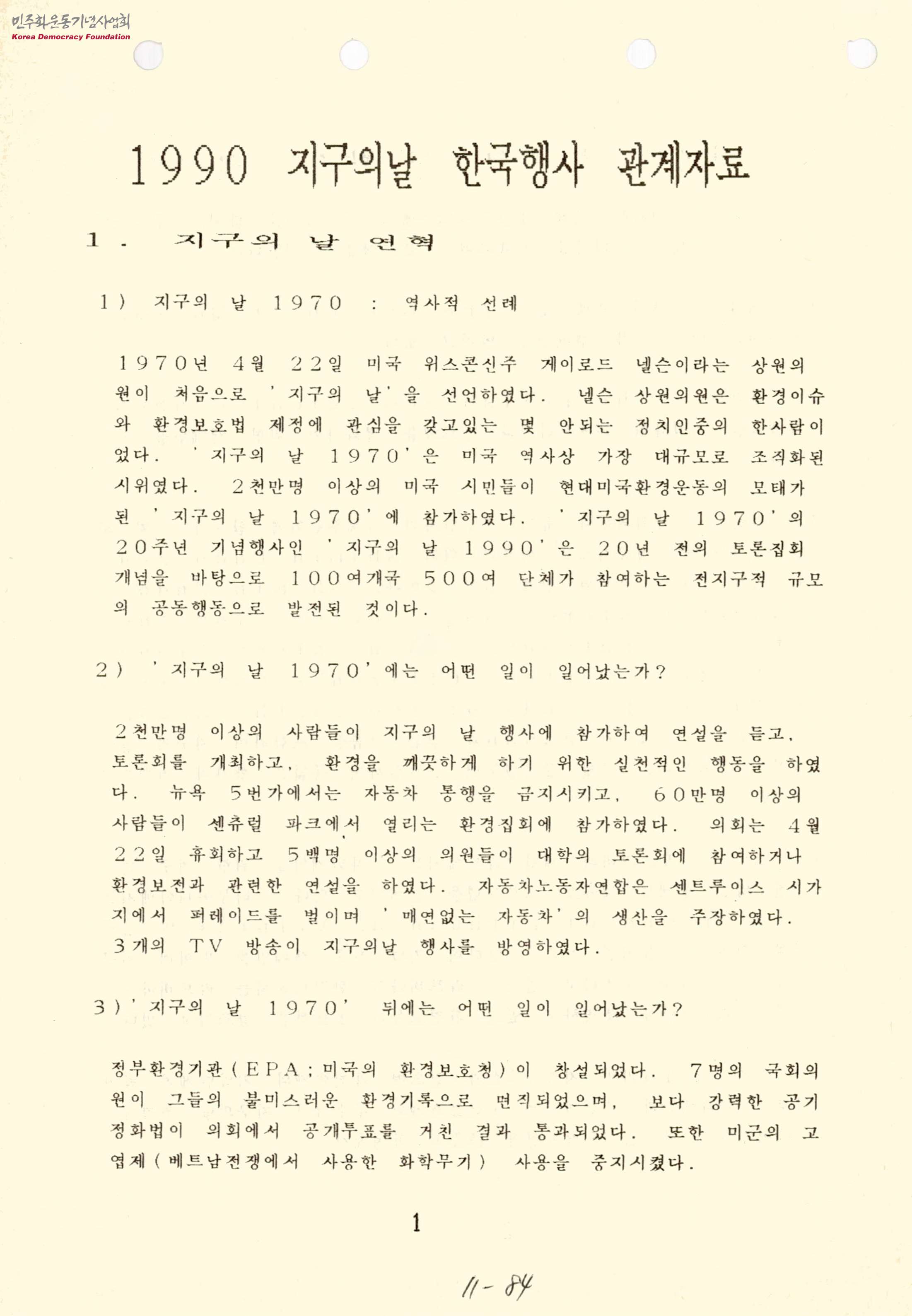 - 1990년 지구의날 한국행사와 관련한 자료로, 지구의 날 연혁, 지구의 날 1990 참가국 보고서, 지구의 날 한국위원회 경과, 1990 지구의 날 한국위원회 조직 등의 내용이 담겨 있음