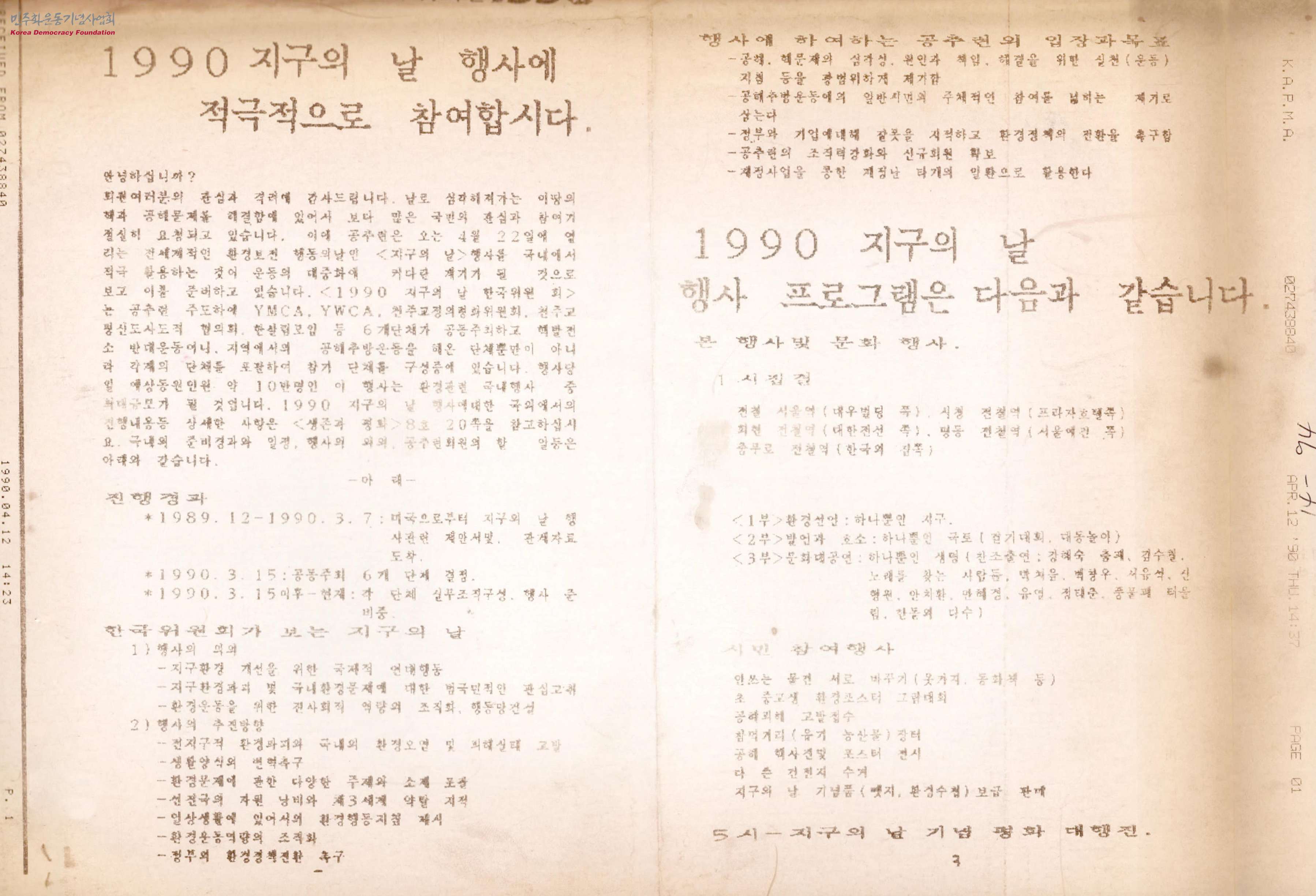 - 날로 심각해져가는 이땅의 핵과 공해문제를 해결하기 위해 공추련에서 마련한 '1990 지구의 날 행사' 참여 독려 문서로, 한국위원회의 행사 프로그램 소개와 함께 진행경과내용을 포함하고 있음