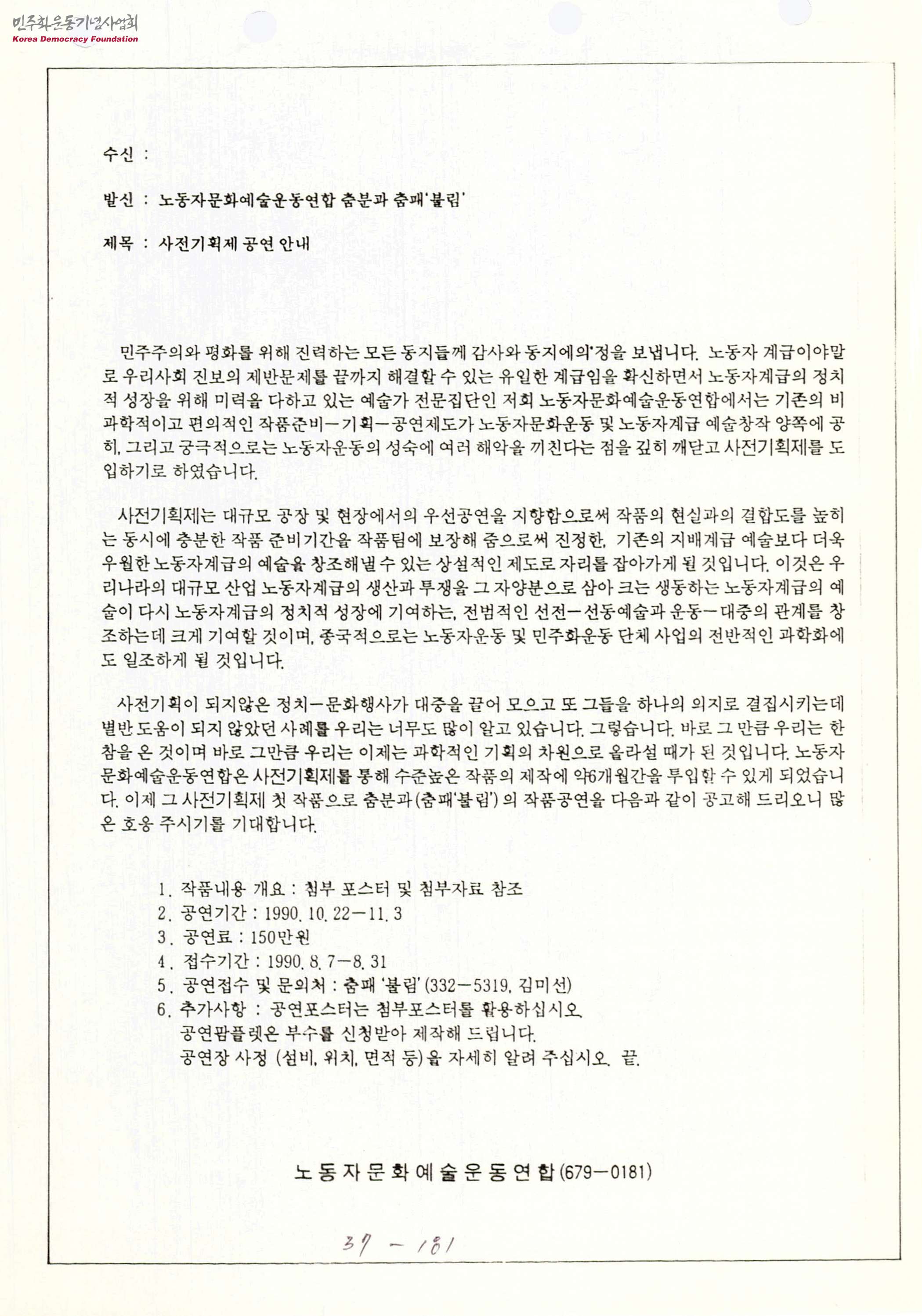 - 기존의 비과학적이고 편의적인 작품준비 기획공연제도가 노동자문화운동 및 노동자계급 예술창작 양쪽에 해악을 끼친다는 점을 깊이 깨닫고 도입하게 된 '사전기획제도' 에 대한 소개와 더불어 첫 작품으로 춤분과의 춤패'불림' 에 대한 공고 문서