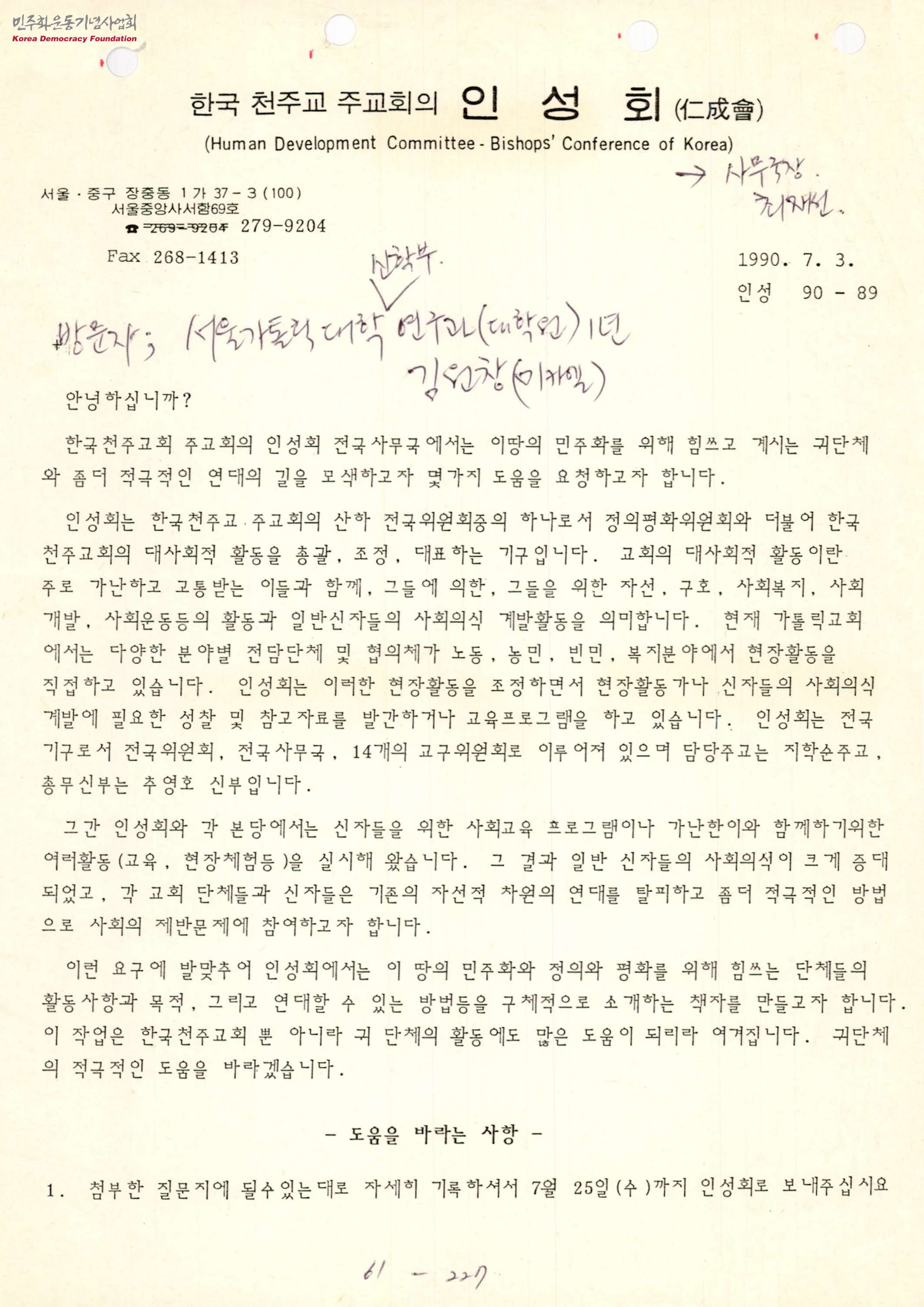 - 한국천주교회 주교회의 인성회 전국사무국에서 민족미술협의회에 연대의 길을 모색하고자 도움을 요청한 문서로, 민주화와 정의와 평화를 위해 힘쓰는 단체들의 활동사항과 목적등을 구체적으로 소개하는 책자를 만들기위해 설문에 응답해주기를 부탁한다는 내용을 담음