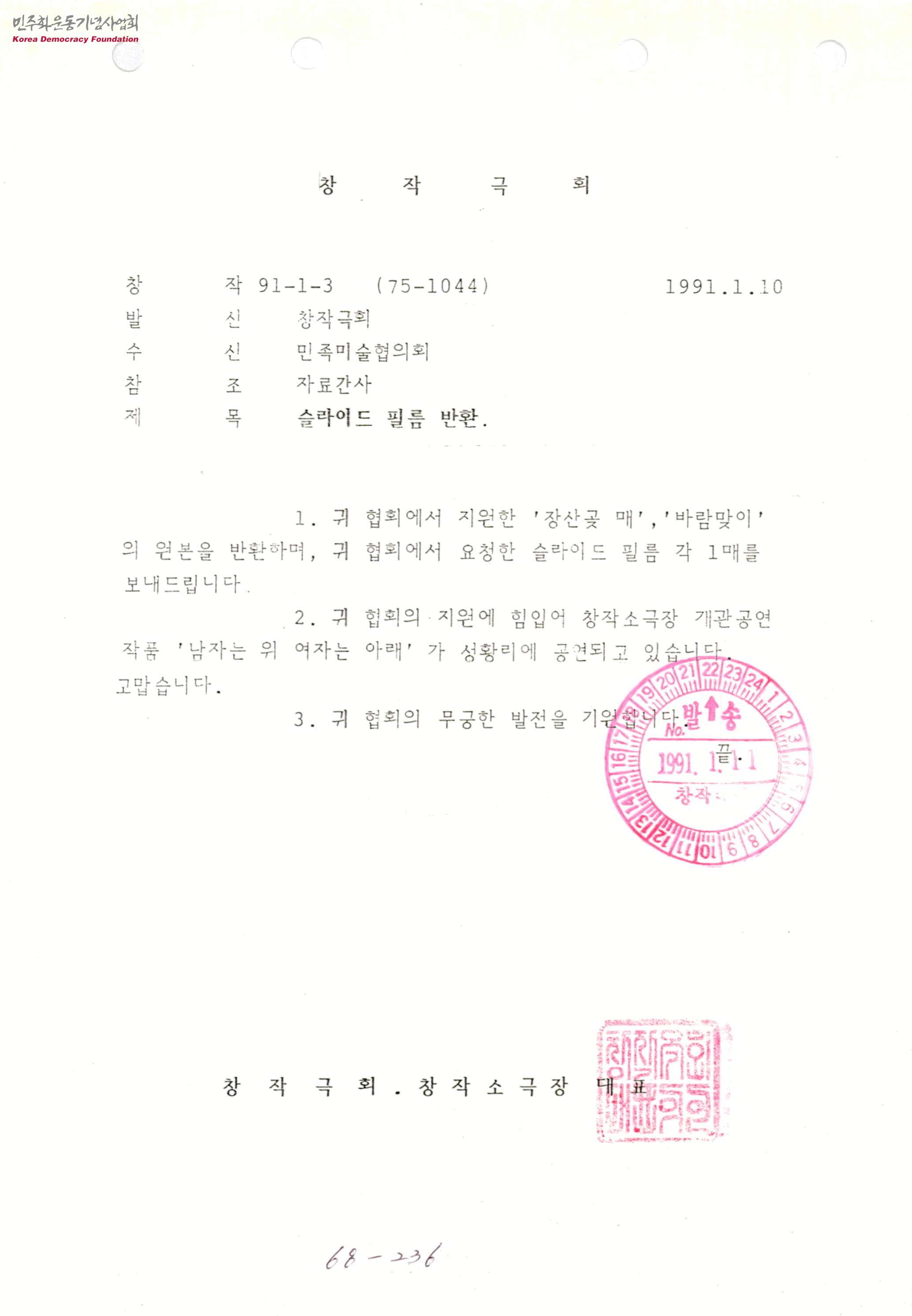 - 창작극회에서 '장산곶 매', '바람맞이'의 원본을 민족미술협의회에 반환한다는 문서로, 지원에 대한 감사인사와 함께 요청한 슬라이드 필름 1매를 첨부하여 보냄