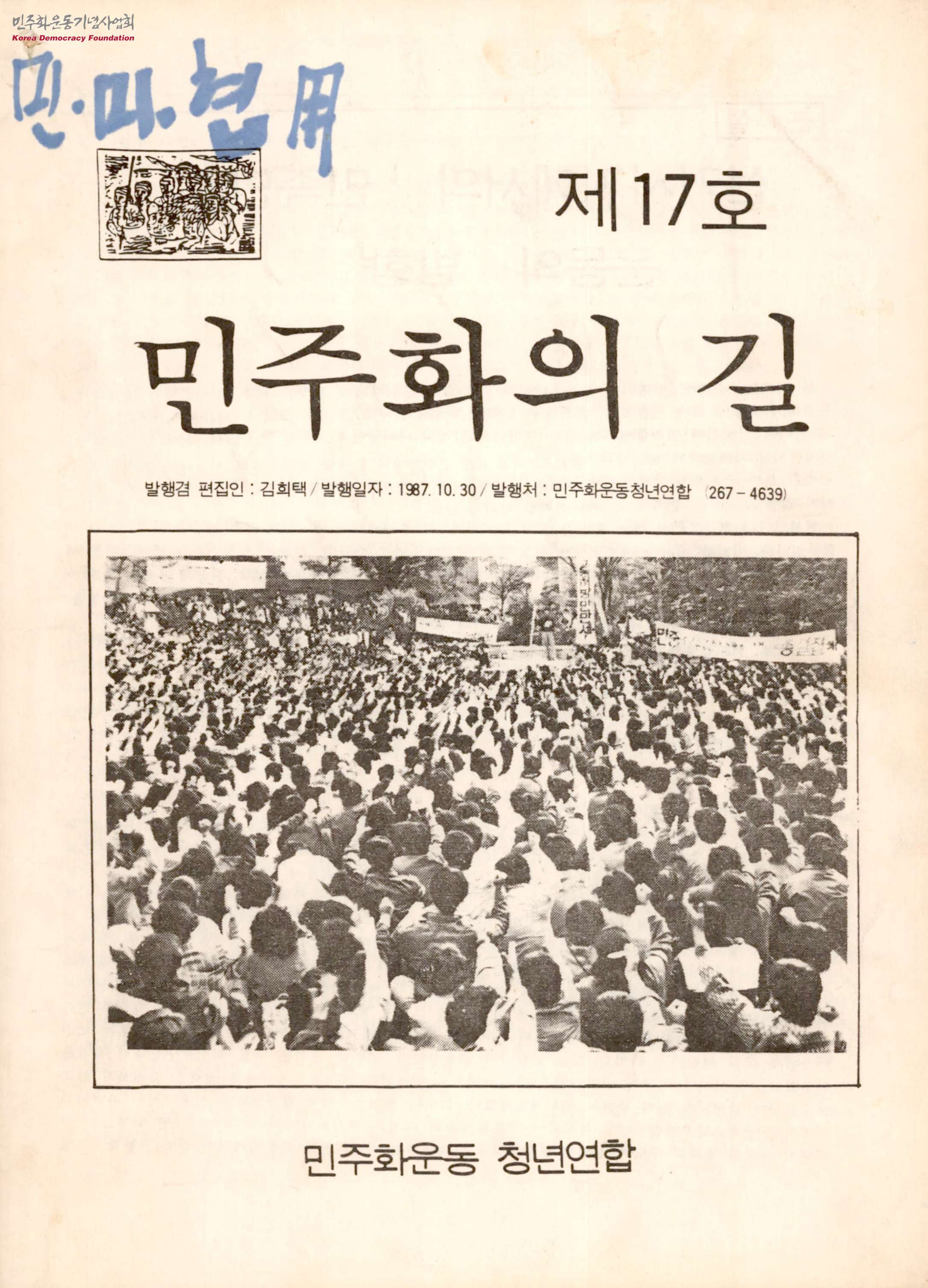 - 1987년 10월 30일에 민주화운동청년연합에서 발간한 제17호 민주화의 길로 목차는 다음과 같이 구성되어 있음 <논설> 선거시기에서의 민족민주운동의 방향 <운동론 시리즈> 청년운동론 試論(시론) <특집> 반독재민주연합전선론의 성과와 과제 <정세분석> 현시기의 전술적 임무에 대하여 <시론> 필리핀선거과정에서의 변혁주체의 대응 <북소리> 임시정부 법통계승을 다시 생각한다! <7,8월 대중투쟁 일지> <규약>