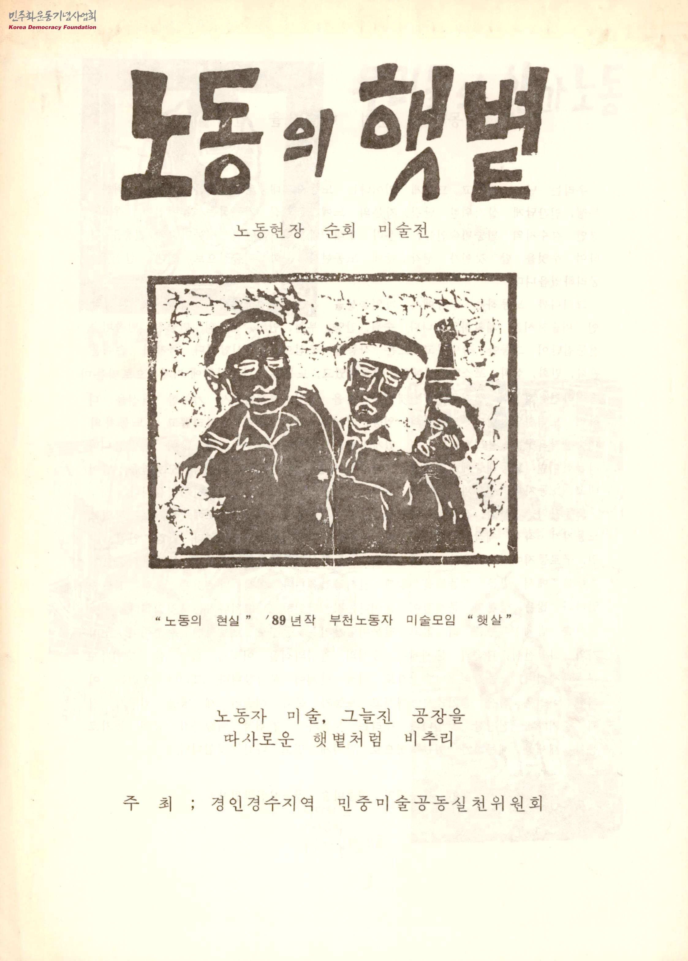- 경인경수지역 민중미술공동실천위원회에서 발간한 노동현장 순회 미술전 노동의 햇볕 전시 팸플릿으로 미술전 축사와 88년작 용접공, 광주집, 순애 등 10점이 담겨 있으며 노동자 미술을 위한 현장 실천의 글이 담겨있음