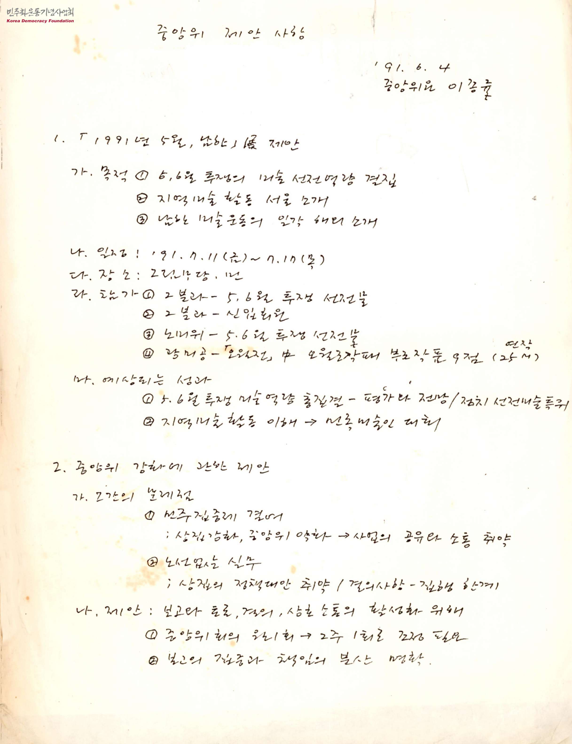- 1991년 6월 4일 중앙위원 이종률이 작성한 중앙위 제안 사항으로 1991년 5월, 남한전 제안과 중앙위 강화에 관한 제안, 통일을 위한 범민족 문화예술인 심포지움 계획, 미술인 간담회 계획 등이 담겨있음