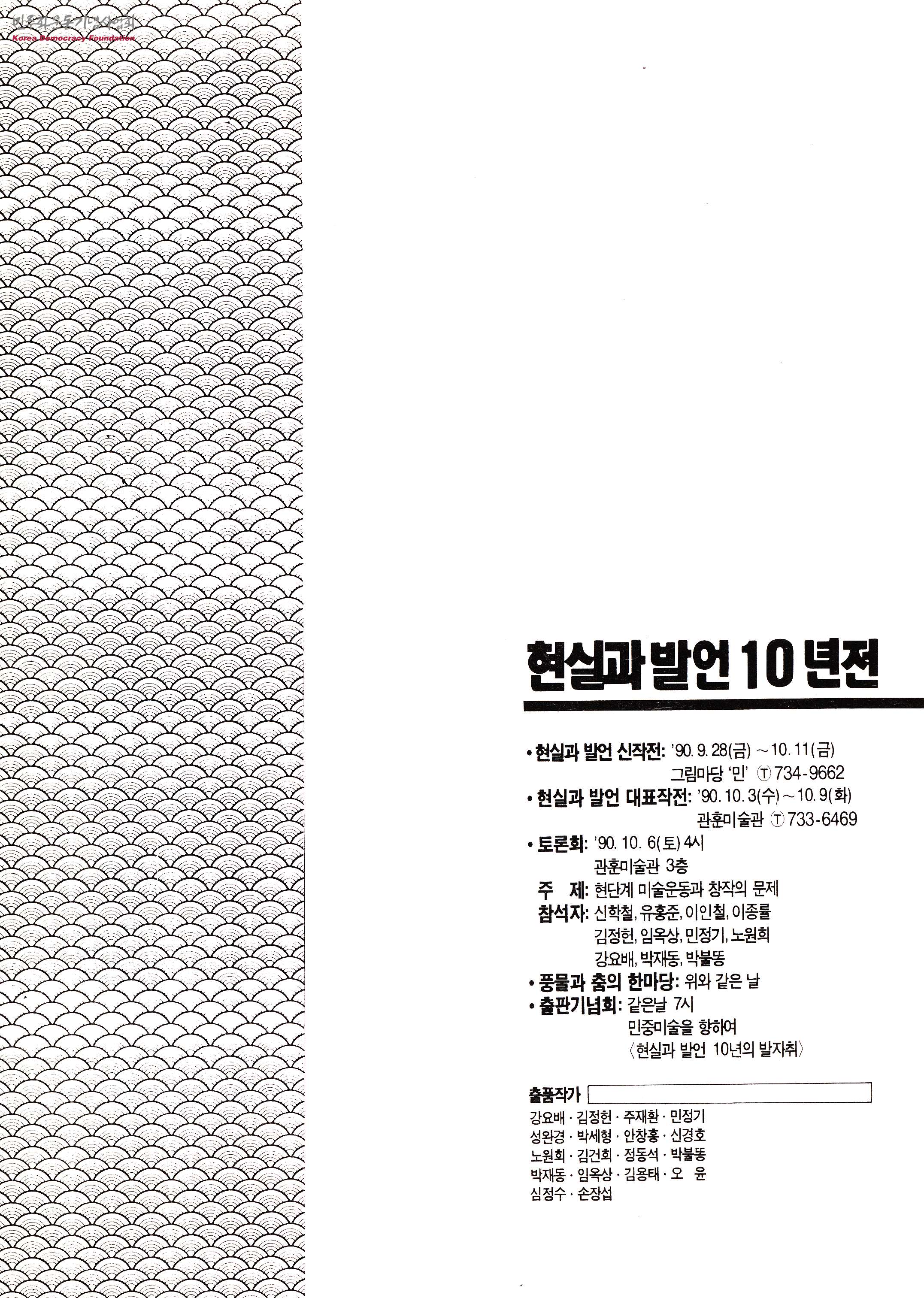 - 1990년 9월 28일 부터 10월 11일까지 그림마당 민에서 진행된 현실과 발언 신작전과 1990년 10월 3일부터 9일까지 관훈미술관에서 현실과 발언 대표작전, 노론회, 풍물과 춤의 한마당, 출판기념회 등 현실과 발언의 10주년 기념 행사의 초대글과 현실과 발언의 연혁 등이 담겨있음