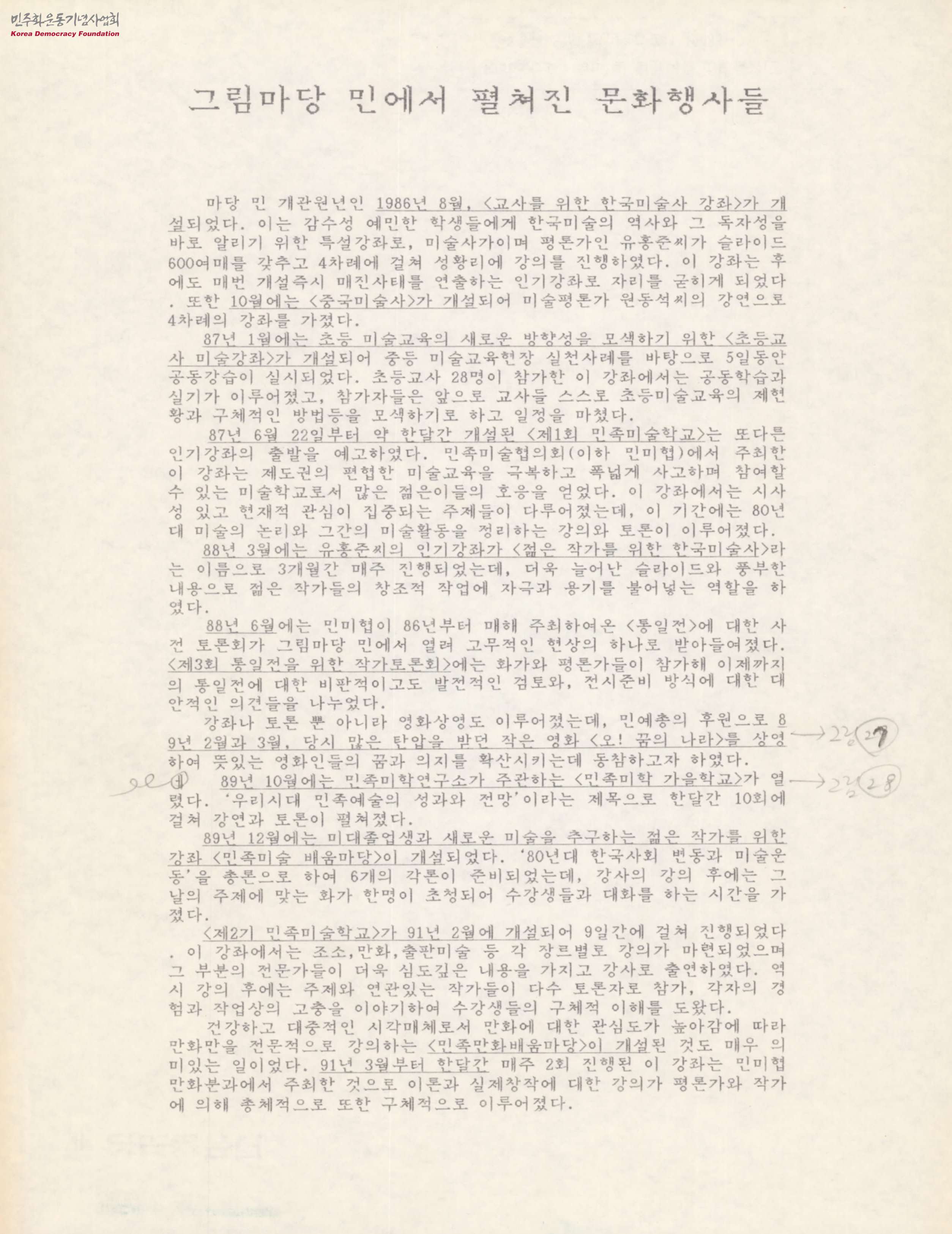 - 1986년부터 1992년까지 그림마당 민에서 이루어진 문화 행사들을 정리한 문서로, 각 연도별 주요 전시들을 중심으로 정리하였으며, 각 전시의 참여 작가, 전시의 성격 및 주제 등에 대한 내용들이 포함되어 있음