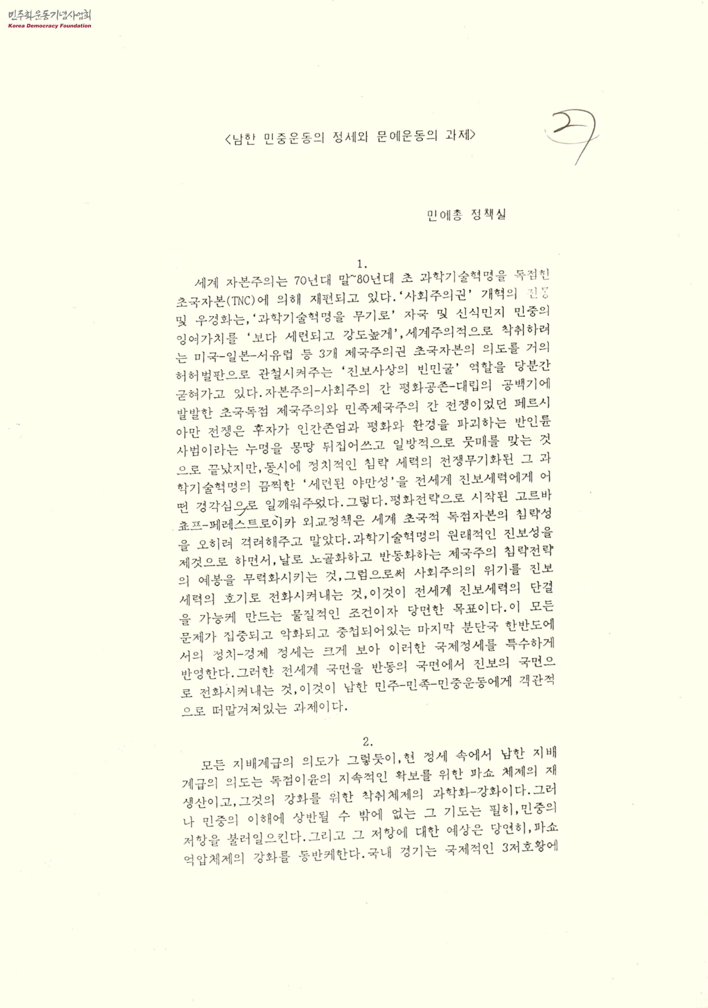 - 민예총 정책실에서 작성한 남한 민족운동의 정세와 문예운동의 과제로 세계제국주의의 팽배와 사회주의권의 위축은 국제정세로 인해 한반도의 민중문예운동이 탄압을 받고 있으며 운동을 탄압하는 현 정권의 반동한 정세에 국제주의적으로 진보-민주주의-예술가-지식인의 연대를 조직해야된다는 내용이 담겨있음
