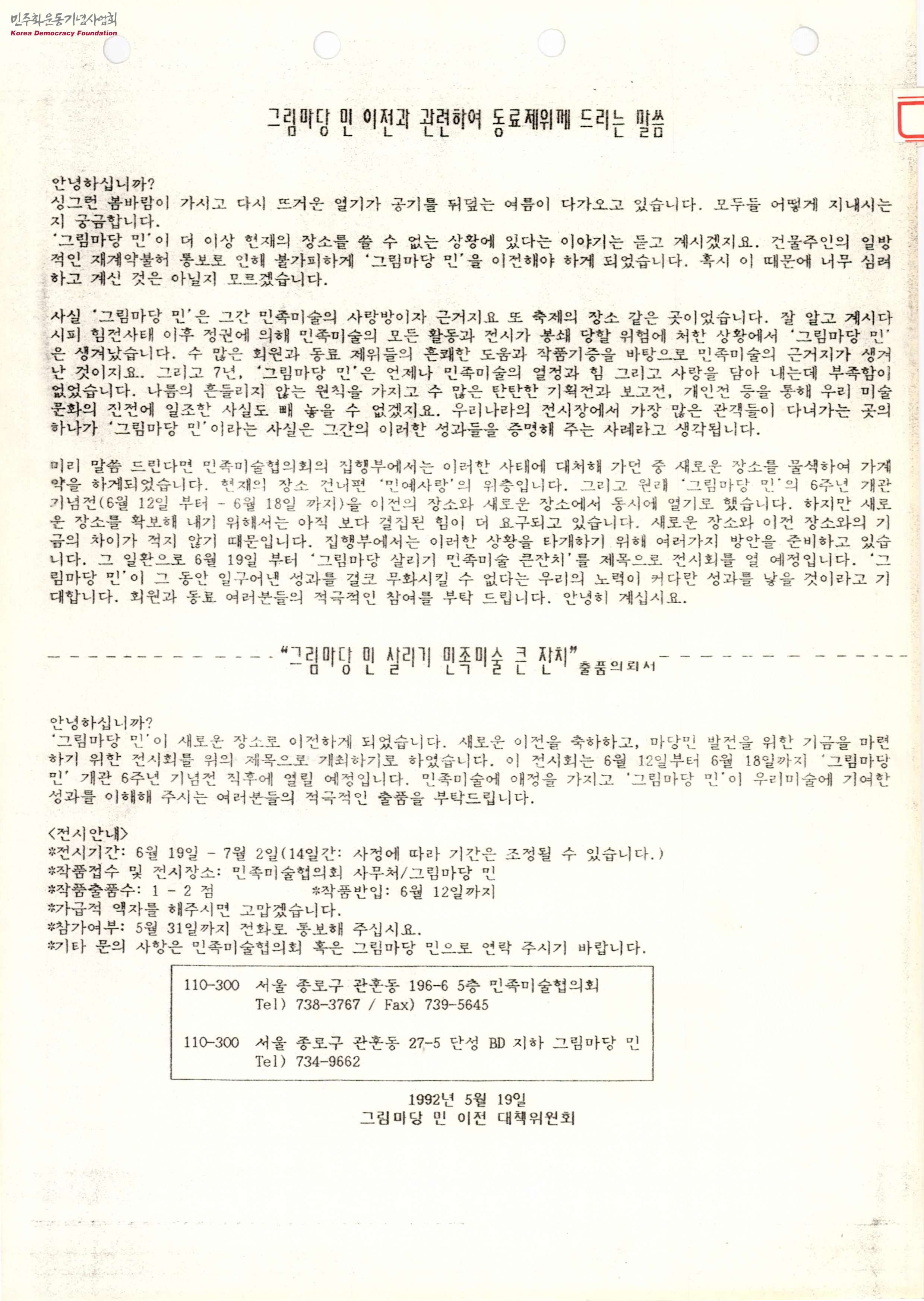 - 1992년 5월 19일 그림마당 민 이전과 관련하여 동료들에게 드리는 말로 그림마당 민이 기존의 진시실에서 새로운 장소로 이동하게 되었고 '그림마당 민'의 6주년 개관전과 그림마당 살리기 민족미술 큰잔치를 개최한다는 내용이 담겨있으며 큰 잔치 출품의뢰서에 대한 내용이 포함되어 있음