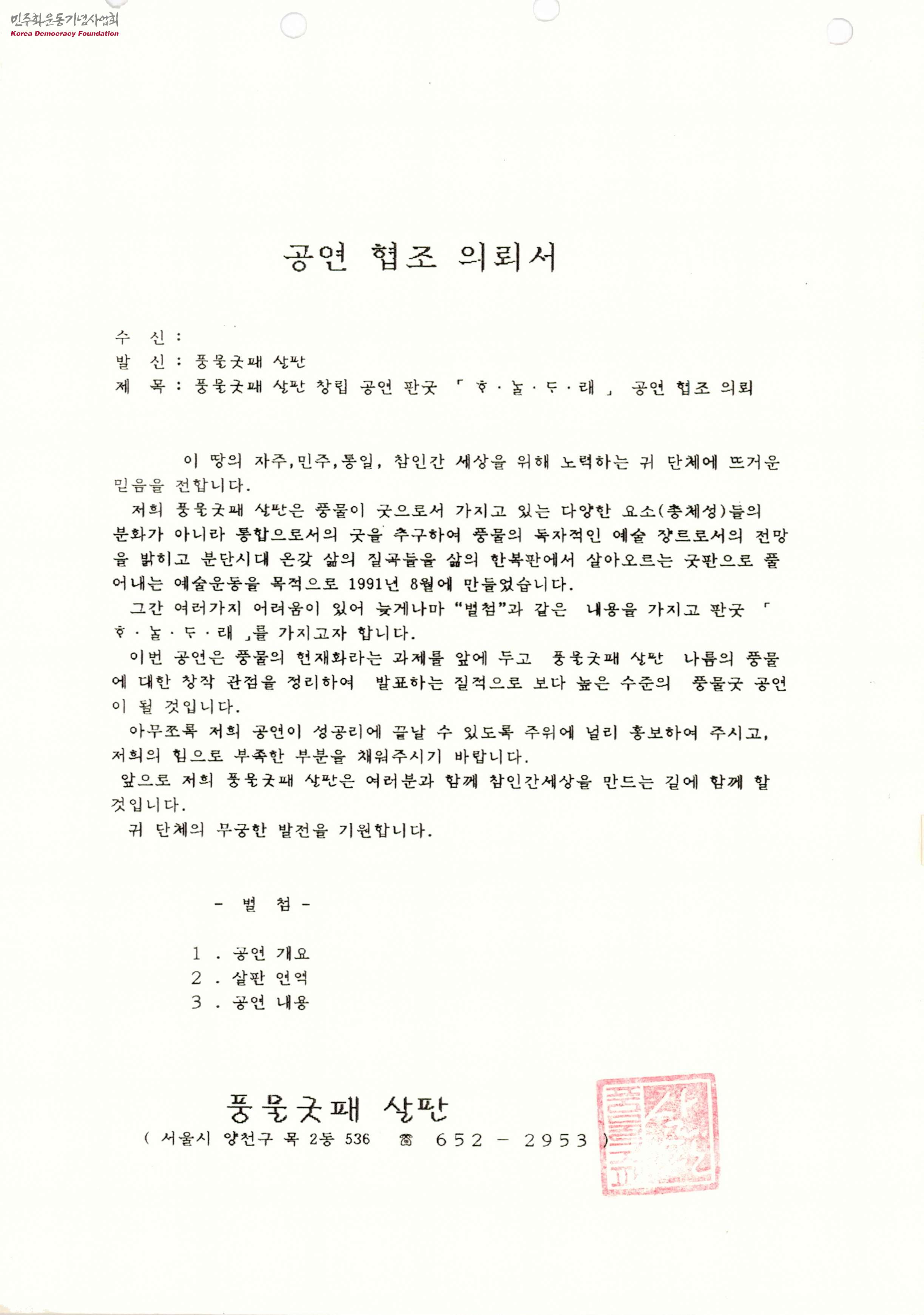 - 풍물굿패 살판 창립 공연 판굿 「하·날·다·래」 공연 협조 의뢰서로, 이 공연은 풍물의 현재화와 풍물에 대한 창작 관점을 정리하여 발표하는 풍물굿 공연이 될 예정이라는 내용과, 공연개요, 살판 연혁, 공연내용 등의 내용이 담겨 있음
