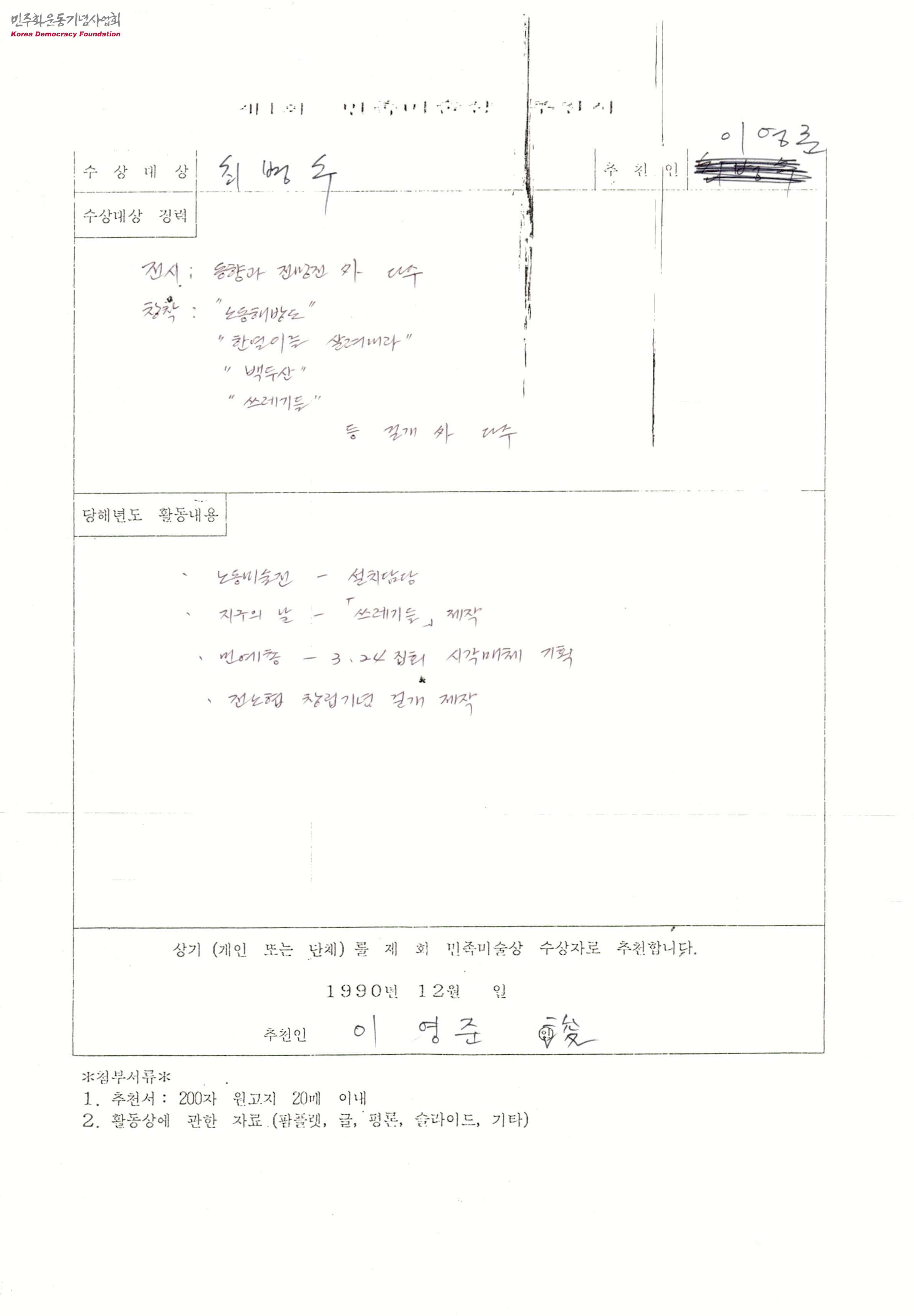 - 1991년 1월 19일 그림마당민에서 진행된 제1회 민족미술상의 추천서로 노동미술위원회와 이영훈이 최병수를 추천하는 내용으로 수상대상 경력과 당해년도 활동이 담겨있음