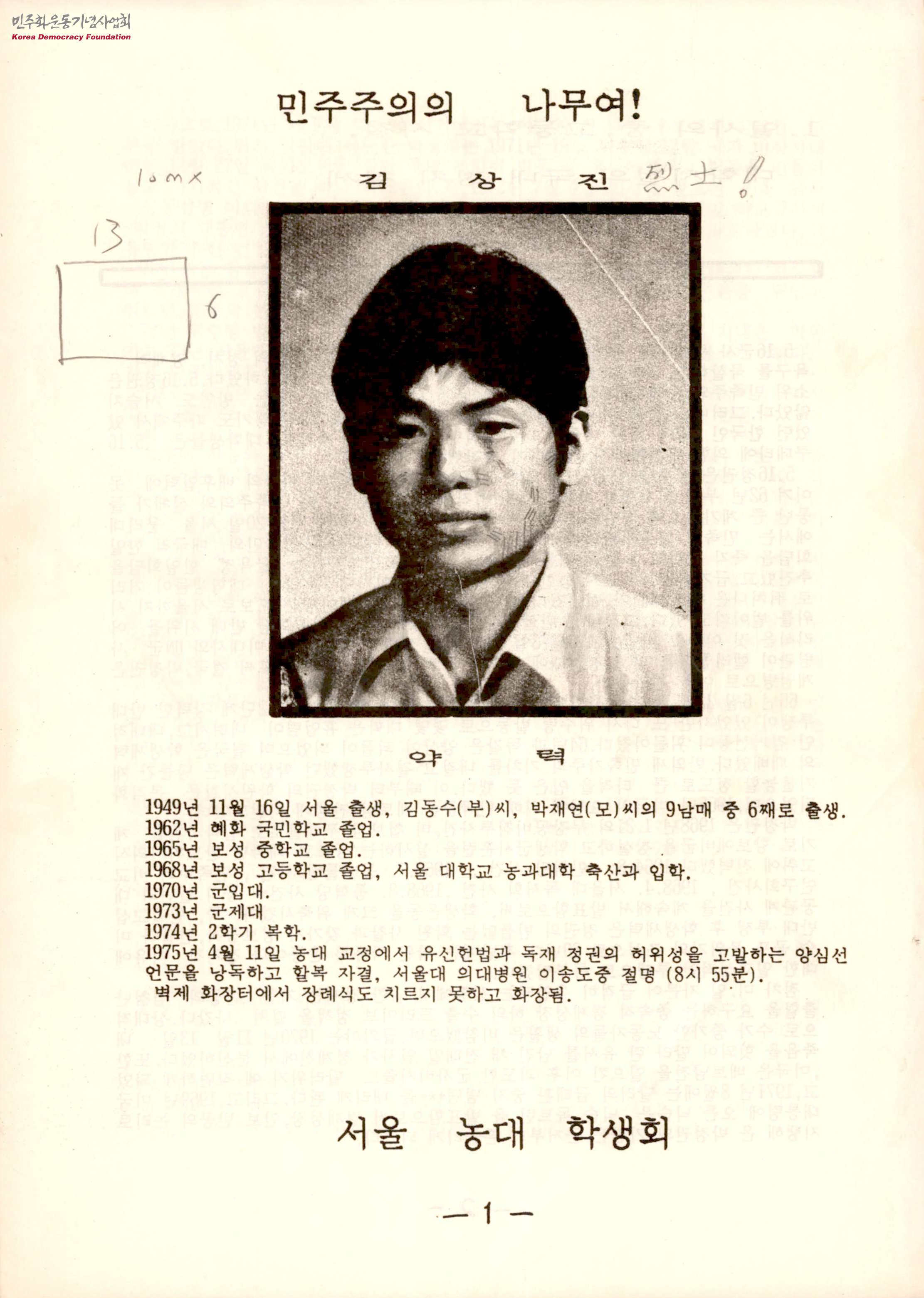 - 김상진 열사의 약력, 열사의 중고등학교 시절(대학시절의 국내 정치 정세), 1975년 3월 말부터 4월 10일까지의 상황, 1975년 4월 11일의 상황, 김상진 열사가 군복무를 하면서 썼던 편지 및 일기, 김상진 열사의 지나간 인생에 대해 서술한 글, 김상진 열사의 양심선언문 등이 담겨 있는 문서. 한편 김상진 열사는 박정희 전 대통령이 이 나라의 헌정 질서를 바로 잡은 후 하야해야 한다는 내용의 유서를 작성한 후 할복하였음