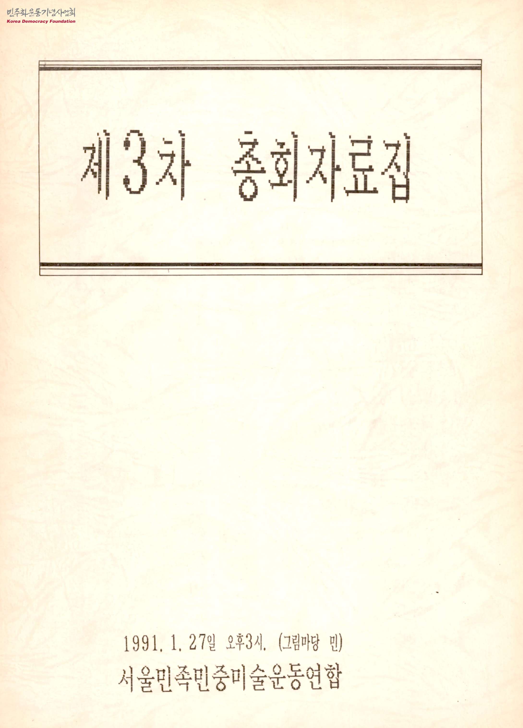 - 1991년 1월 27일 그림마당 민에서 개최된 제3차 총회에 대한 자료집으로, 의장 인사말, 제2기 서미련 평가, 중앙위원회 등 서미련 산하 단위 및 위원회 활동평가, 1991년 서미련 사업방향, 1991년 민족민중미술운동의 과제와 임무, 강령, 규약, 총회준비위원회 경과보고, 전시 관련 보고 등의 내용이 담겨 있음