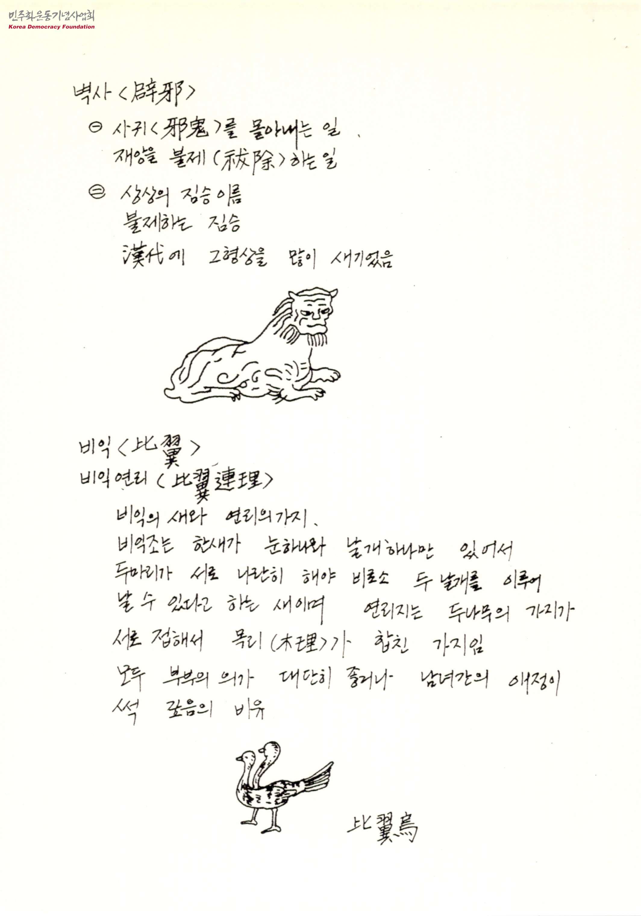 - 벽사, 비익, 비익연리, 연리지 등 상상의 동물과 신성시 여겨지는 식물을 스캐치하고 각 대상에 관한 설명을 정리한 자필 메모