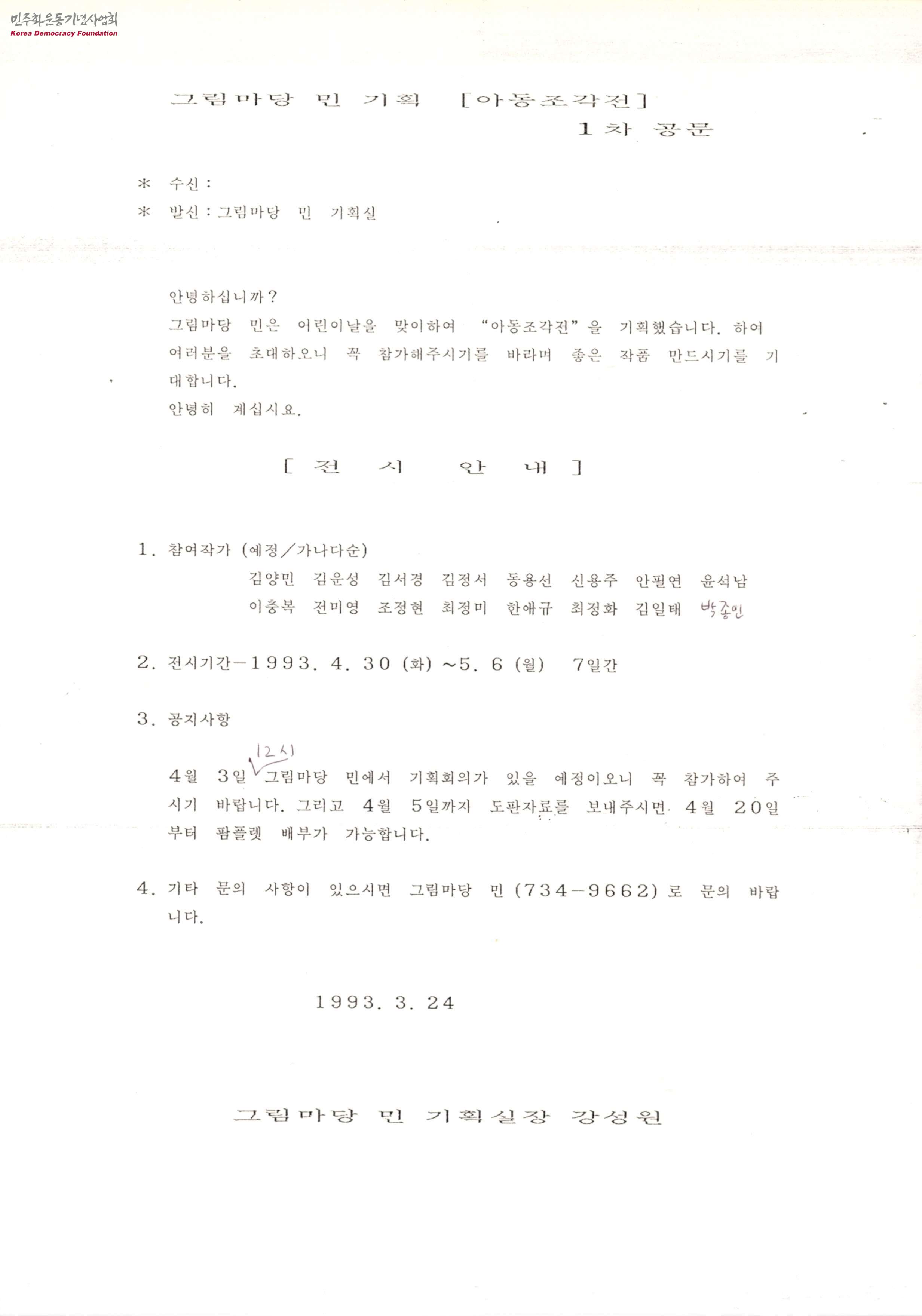 - 어린이 날을 맞아 그림마당 민은 '아동조각전'을 기획하게 되었으니 작가분들은 본 기관의 초대에 응하여 좋은 작품을 출품해 주길 바란다는 내용과 예정 참여작가 명단, 전시 기간, 도판자료 제출 기한 등 전시 관련 내용을 안내하는 내용이 담겨 있는 공문