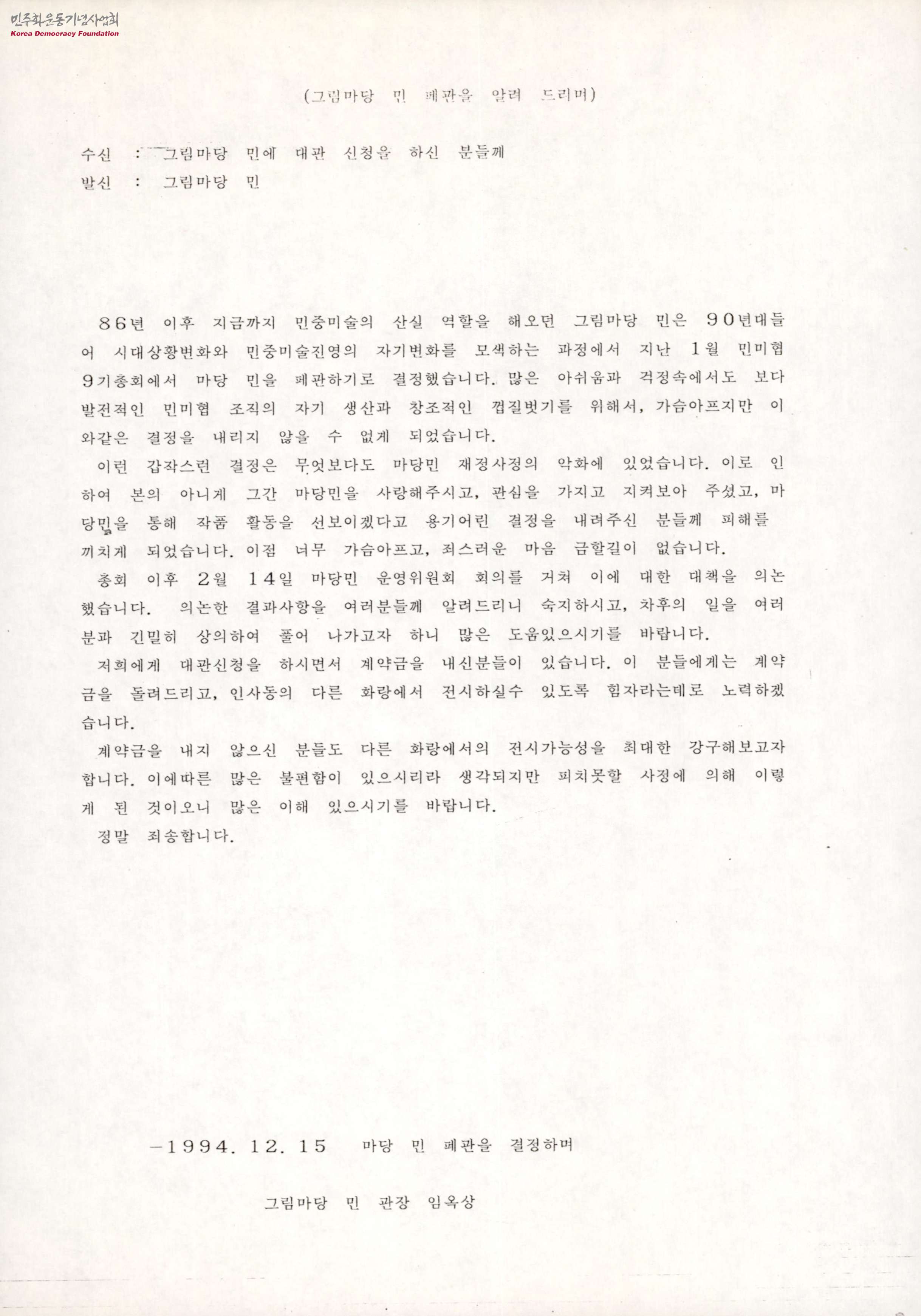 - 1986년부터 민중미술의 산실 역할을 해오던 그림마당 민은 1994년 1월 민미협 9기 정기총회에서 폐쇄를 결정하게 되었고, 이후 2월 14일 마당민 운영위원회 회의에서 추후 일정과 관련한 것들을 논의하고 있으니, 그간 많은 관심을 주셨던 민족미술인분들께 죄송한 마음을 표하고, 앞으로도 꾸준한 관심을 바란다는 내용의 문서