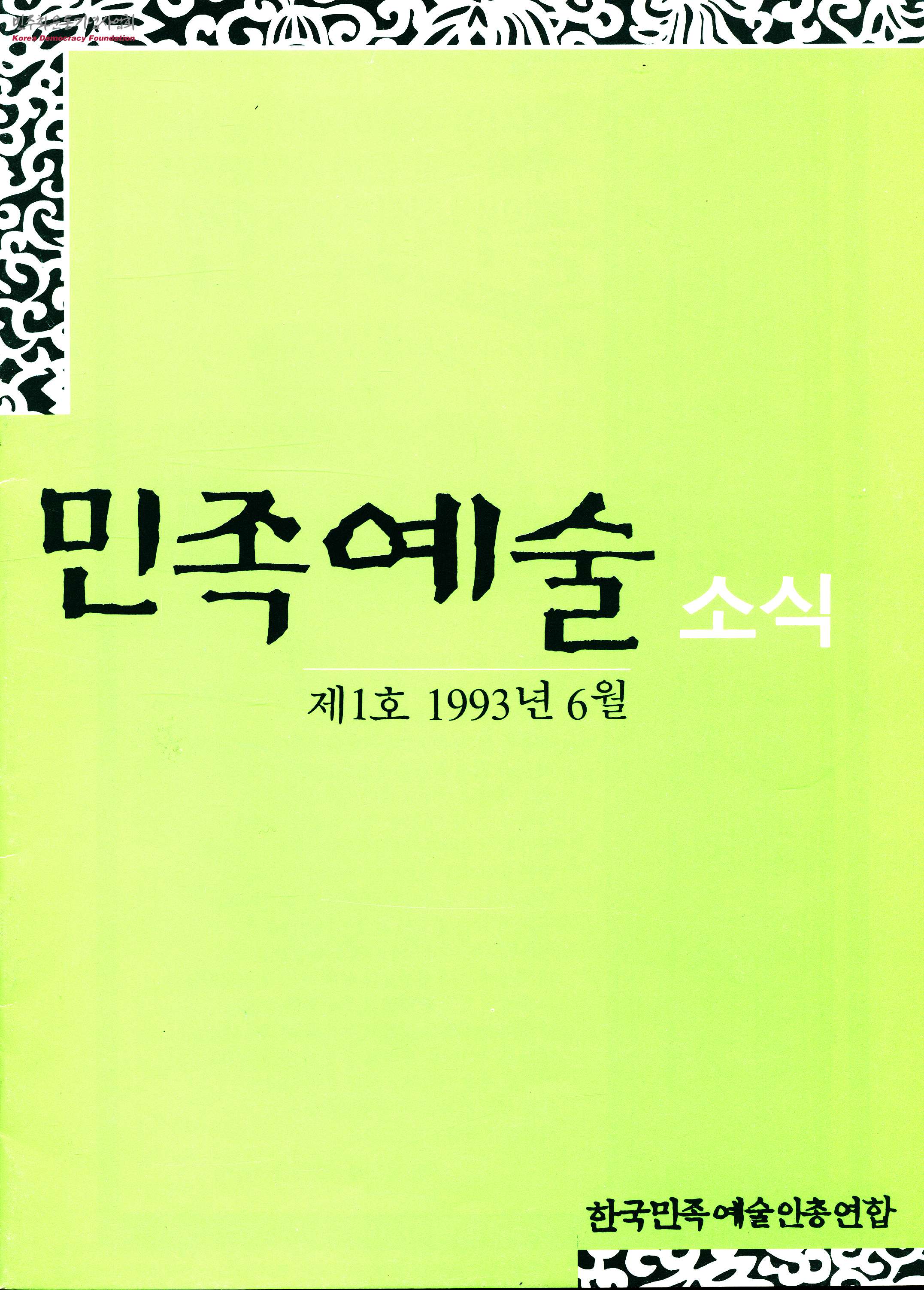 - 1993년 6월 한국민족예술인총연합에서 발행한 '민족예술 소식'지 제1호로, 목차는 다음과 같음 - 권두칼럼 전환기의 민족예술론 - 특별보고 민예총 사단법인화 추진에 대하여 - 사무처소식 민족예술회관 마련을 위한 그림전시회 보고 - 행사보고1 / 문화개혁을 위한 정책토론회 - 행사보고2 / 문화체육부 주관 토론회 참석 일정 - 문예시평 박제화된 판소리의 영화 - 성명서 5·18민중항쟁 제13주기를 맞는 우리의 입장