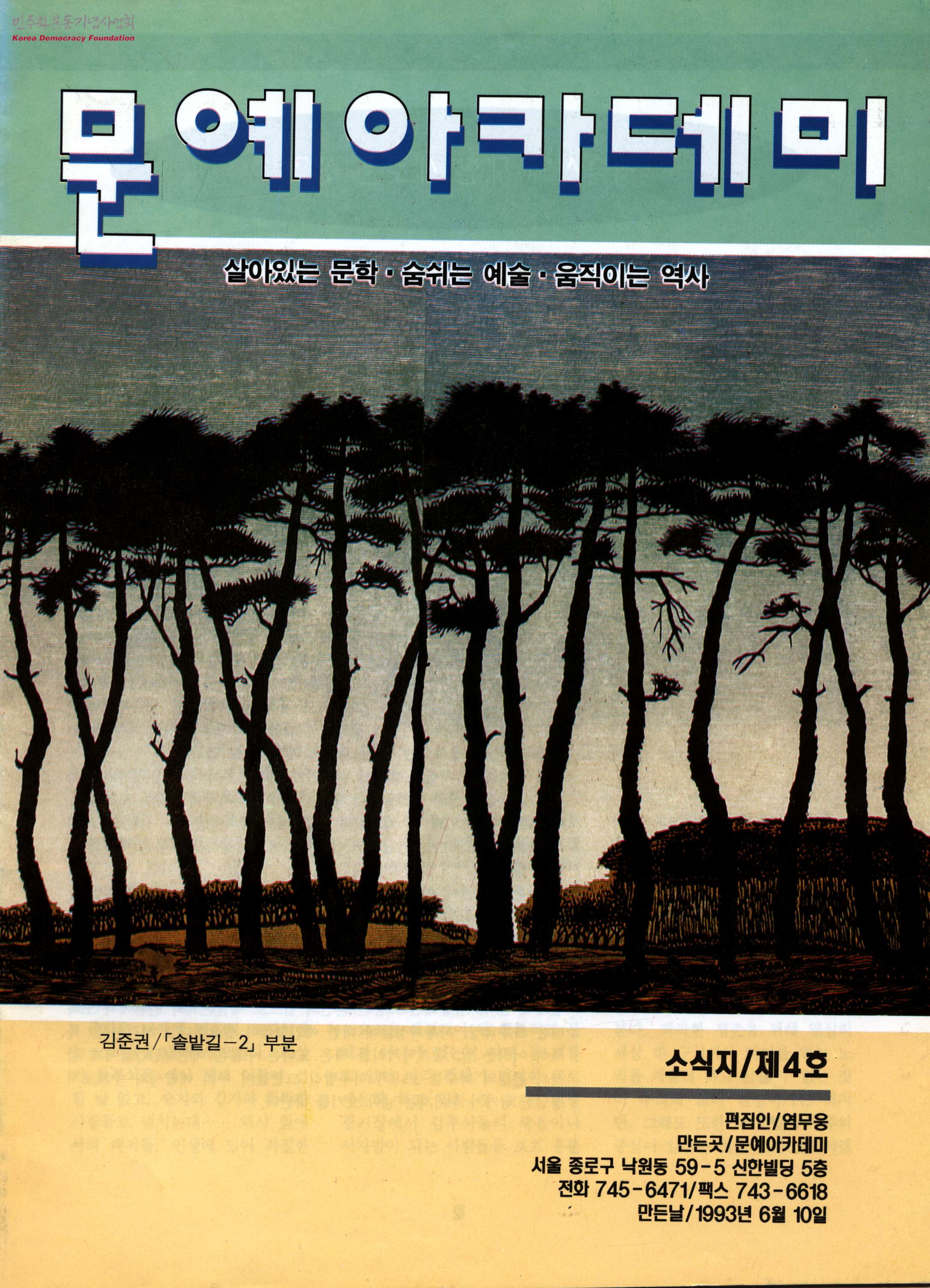 - 김준권 작가의 '솔밭길-2' 작품 중 일부가 표지를 장식하고 있는 문예아카데미 소식지 제4호로, 목차는 다음과 같음 - 칼럼 예술사에 대한 새로운 생각 - 수강생 이야기 전업주부의 인생을 돌아보며 「근·현대 연극의 형성과 발전」을 듣고 열정과 겸손의 계기 - 함께 읽는 강의 스타니슬라브스키와 마이어홀드 연출론 - 못다한 강의 - 함께 일구는 민족예술 문민시대, 신세대의 대중문화 소리와 북, 소리와 빛-영화 「서편제」를 보고 - 강좌 한 학기를 마치며 「장산곶매 영화학교」를 마치며 - 민예총 소식