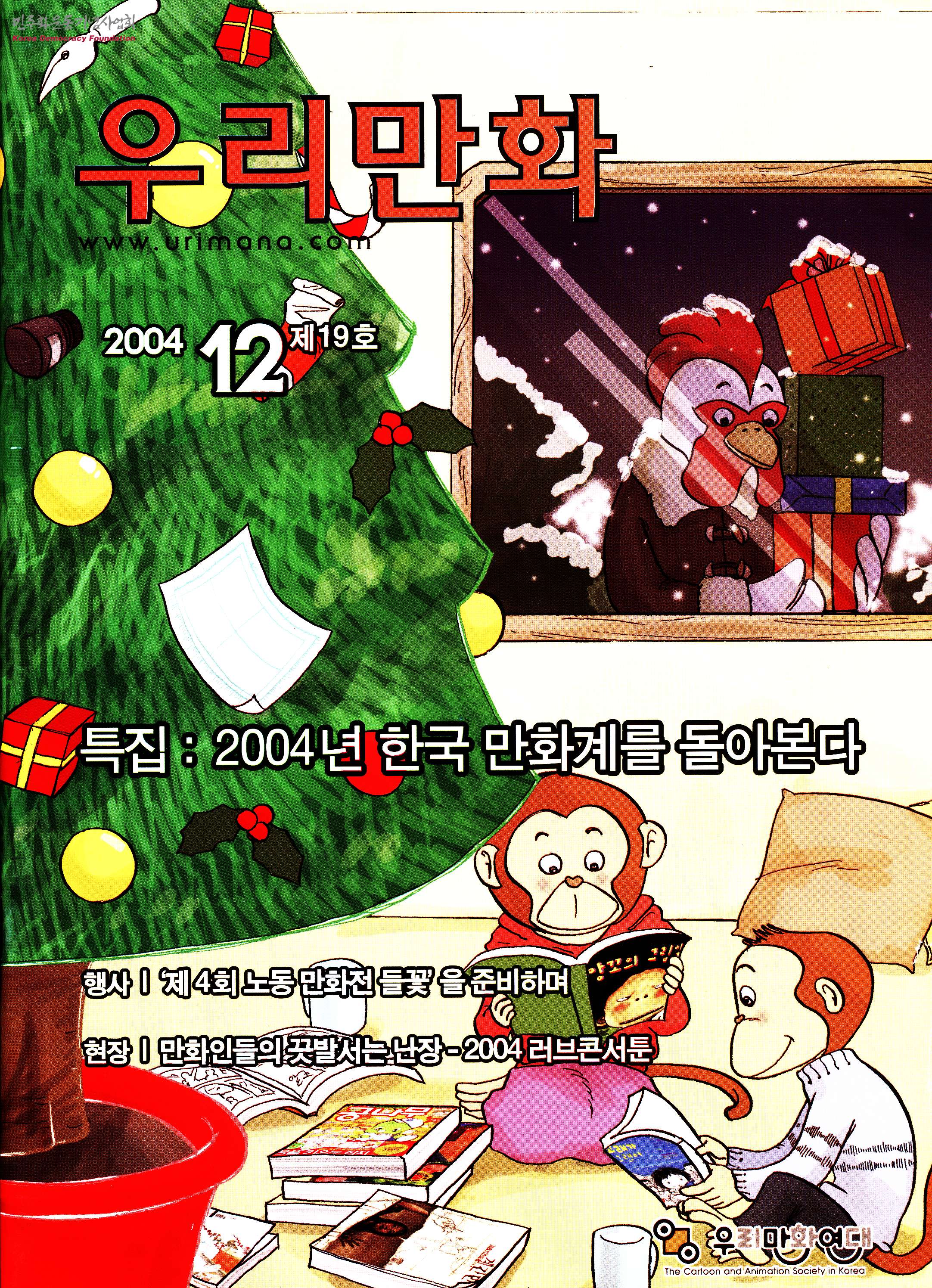 - 2004년 11월 28일에 발행한 우리만화 2004년 12월호 통권 19호로 목차는 다음과 같음 1. 시선집중 2. 시론-만화와 교육 3. 만평 4. 특집 2004년 한국만화계를 돌아본다 5. 이야기 만화-동거 6. 진료실 블루스-면목없어요. 할머니 7. 행사-'제4회 노동만화전 들꽃' 을 준비하며 8. 새로 나온 책 9. <우리만화>가 만난 사람-<앙꼬의 그림일기> 10. 자객열전-라이벌 11. 삼매경<창의성의 즐거움> 12. 카툰-덤&둠 13. 현장-만화인들의 끗발서는 난장 14. 쪽만화-리니의 자취요리 대작전 15. 만화계 문화계 16. 독자의소리/공지사항 17. 이웃풍경