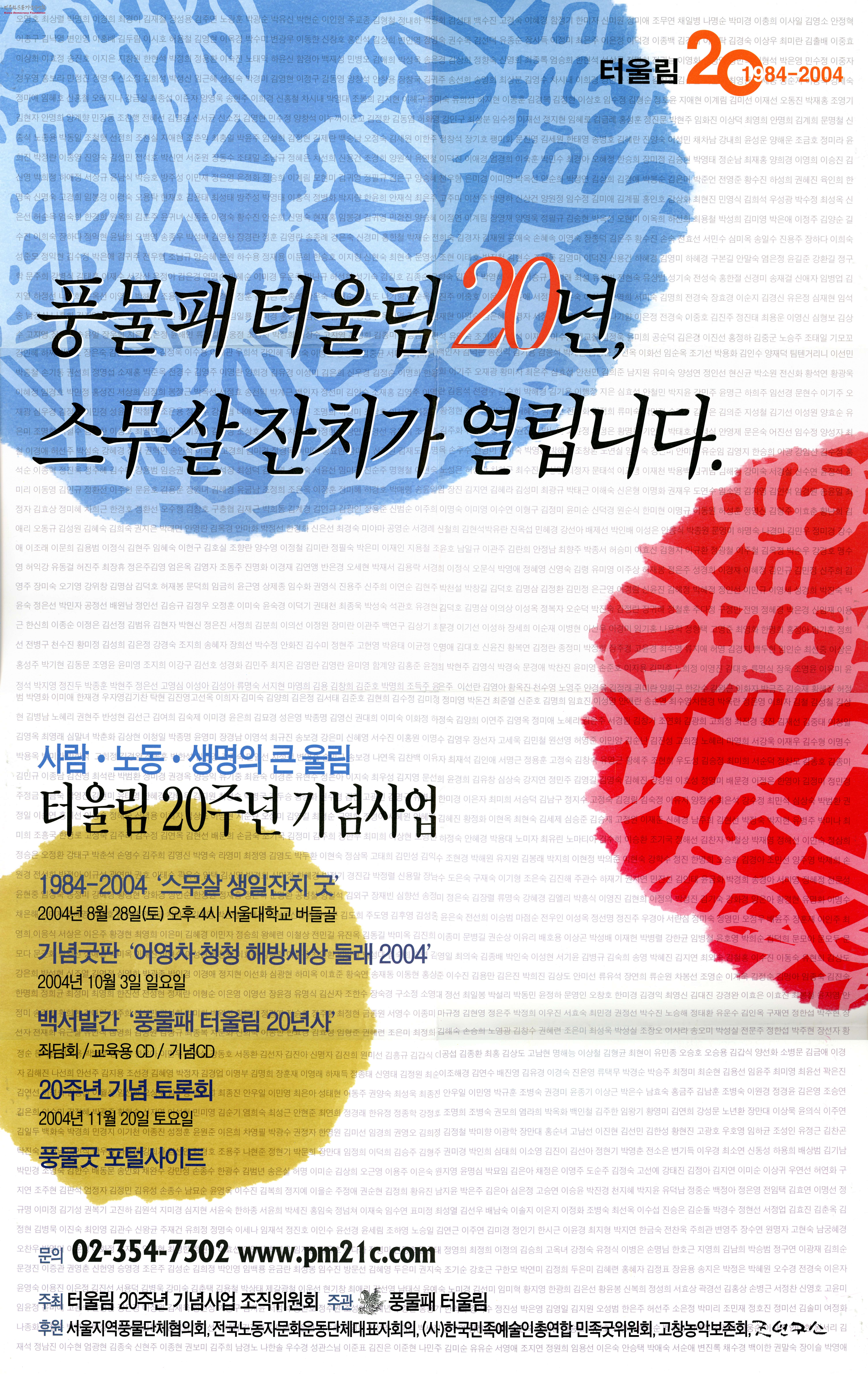 - 풍물패 터울림에서 20주년을 맞이하여 기획한 행사 포스터로, '어영차 청청 해방세상 들래 2004' 기념굿판과 함께 '20주년 기념 토론회' 등 다양한 행사에 대하여 홍보를 목적으로 하는 내용이 담겨 있으며 각 행사의 일시를 포함하고 있음