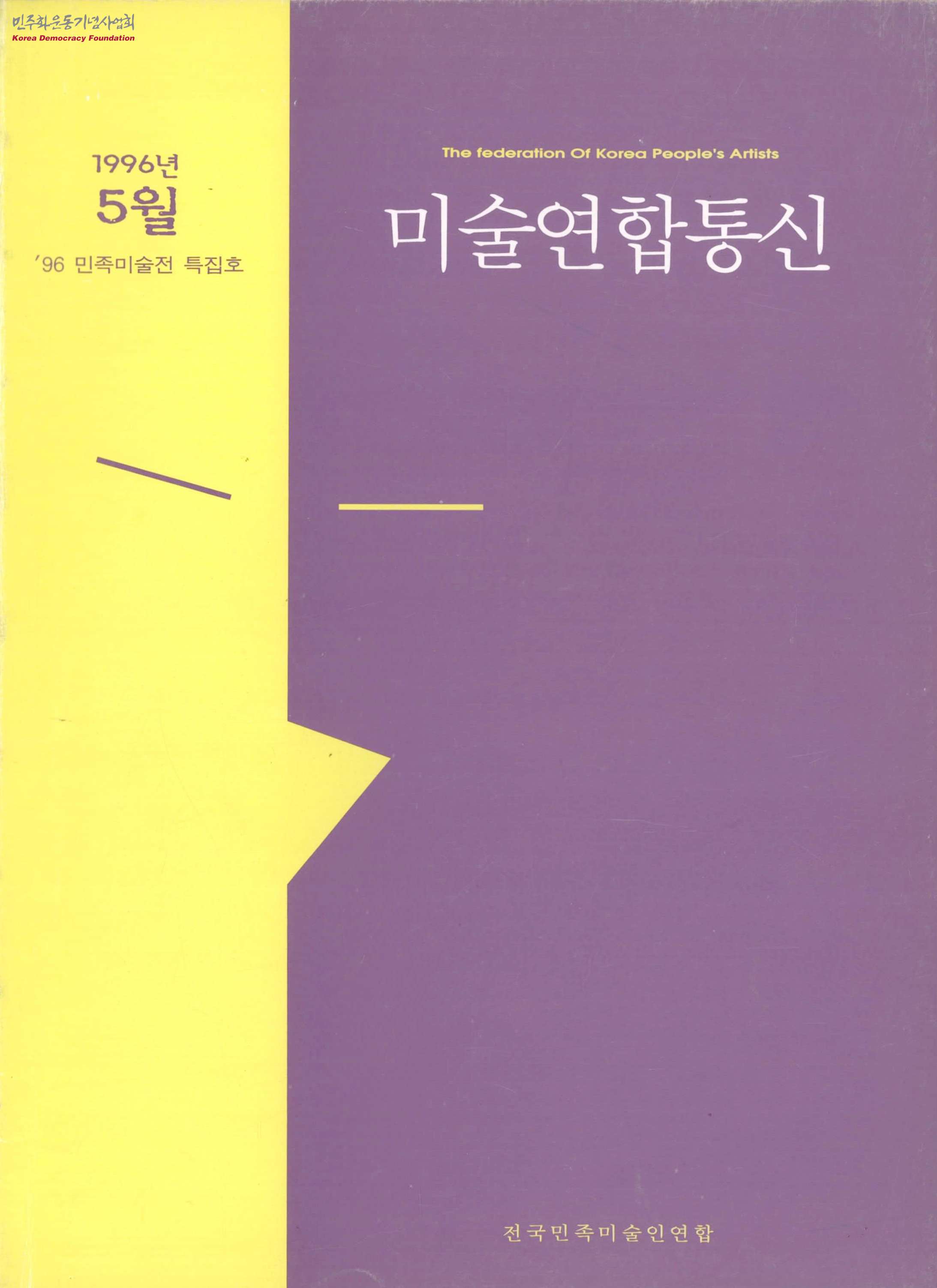 - 1996년 5월 15일 전국민족미술인연합에서 발간한 미술연합 통신 제5호로 목차는 다음과 같이 구성되어 있음 이달의 글 / 벌레로서의 예술가의 초상화 특집 1 ∙ '96 민족미술전 / 전국연대, 그 지역간 미술운동의 차별적인 담론을 위하여 기획연재 / 예술과 정치-독일 68세대 예술, 그 전개와 의의(2) 특집2 ∙ 특별좌담 / 하리우 선생과 함께 특집3 ∙ 아동미술교육의 현황 / 아동미술교육:창의력있는 인간인가? 화가로 키울것인가? 전시평 / 정치와 미술전 감초이야기 / 여심가 회원글발 / 만화에 대해 알고 싶은 두세가지 것들