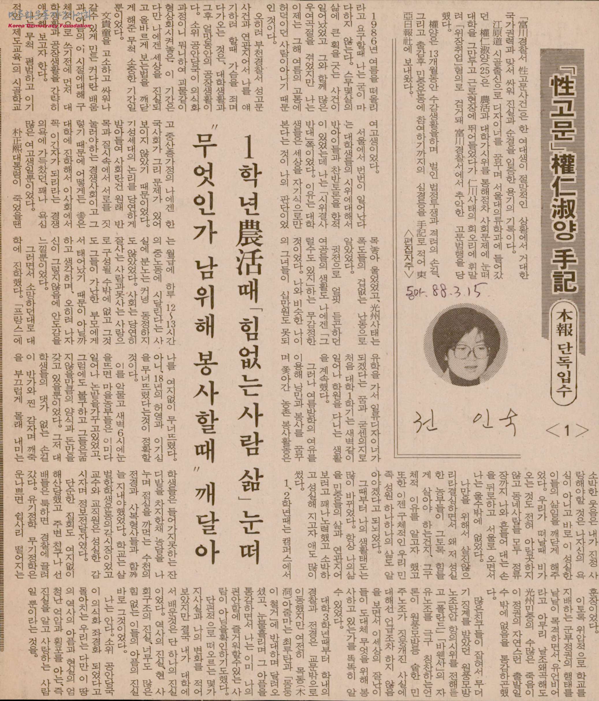 [신문스크랩]「性(성)고문」權仁淑(권인숙)양 手記(수기)