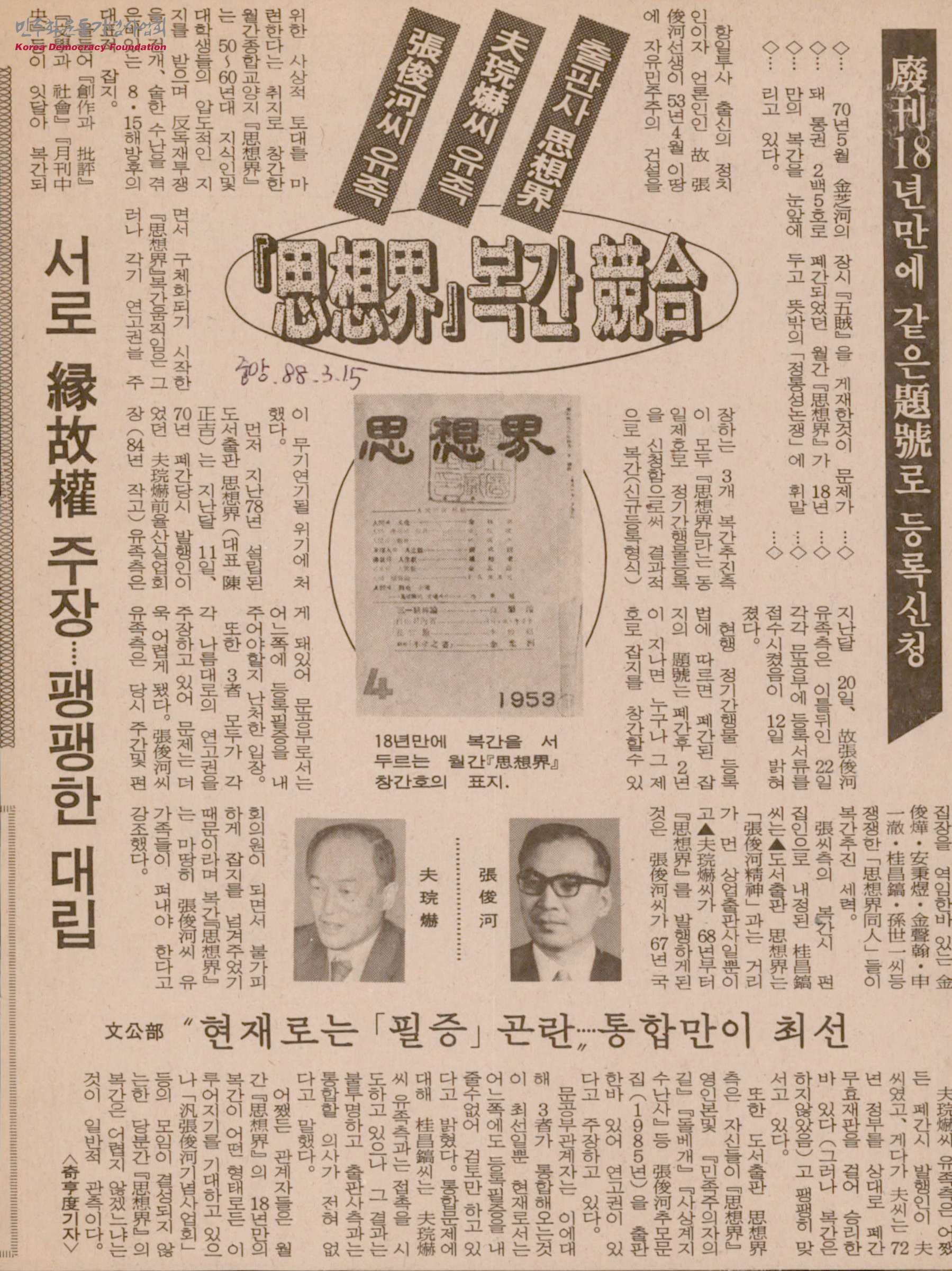 [신문스크랩]廢刊(폐간)18년만에 같은 題號(제호)로 등록신청