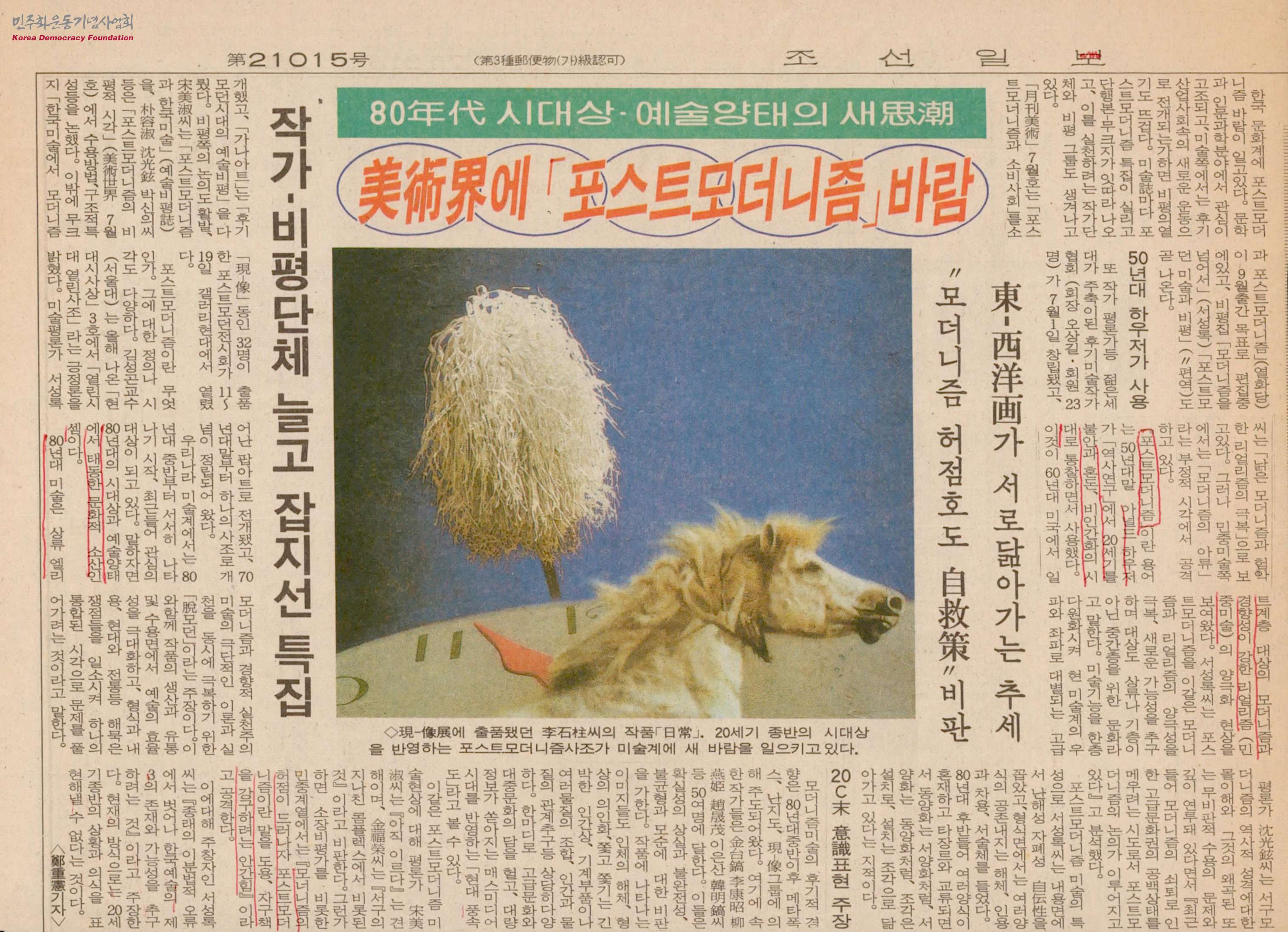 - 문학과 인문과학분야에서 포스트모더니즘 관심이 고조되고, 미술쪽에서는 후기 산업사회 속의 새로운 운동으로 전개되는가 하면, 비평의 열기도 뜨거워지고 있음. 이에 더해 미술지마다 포스트모더니즘 특집이 실리고 단행본 및 무크지가 잇따라 나오고, 이를 실천하려는 작가단체와 비평 그룹도 생겨나고 있는 등 미술계가 포스트모더니즘을 받아들이려는 움직임을 보이고 있다는 내용의 신문스크랩