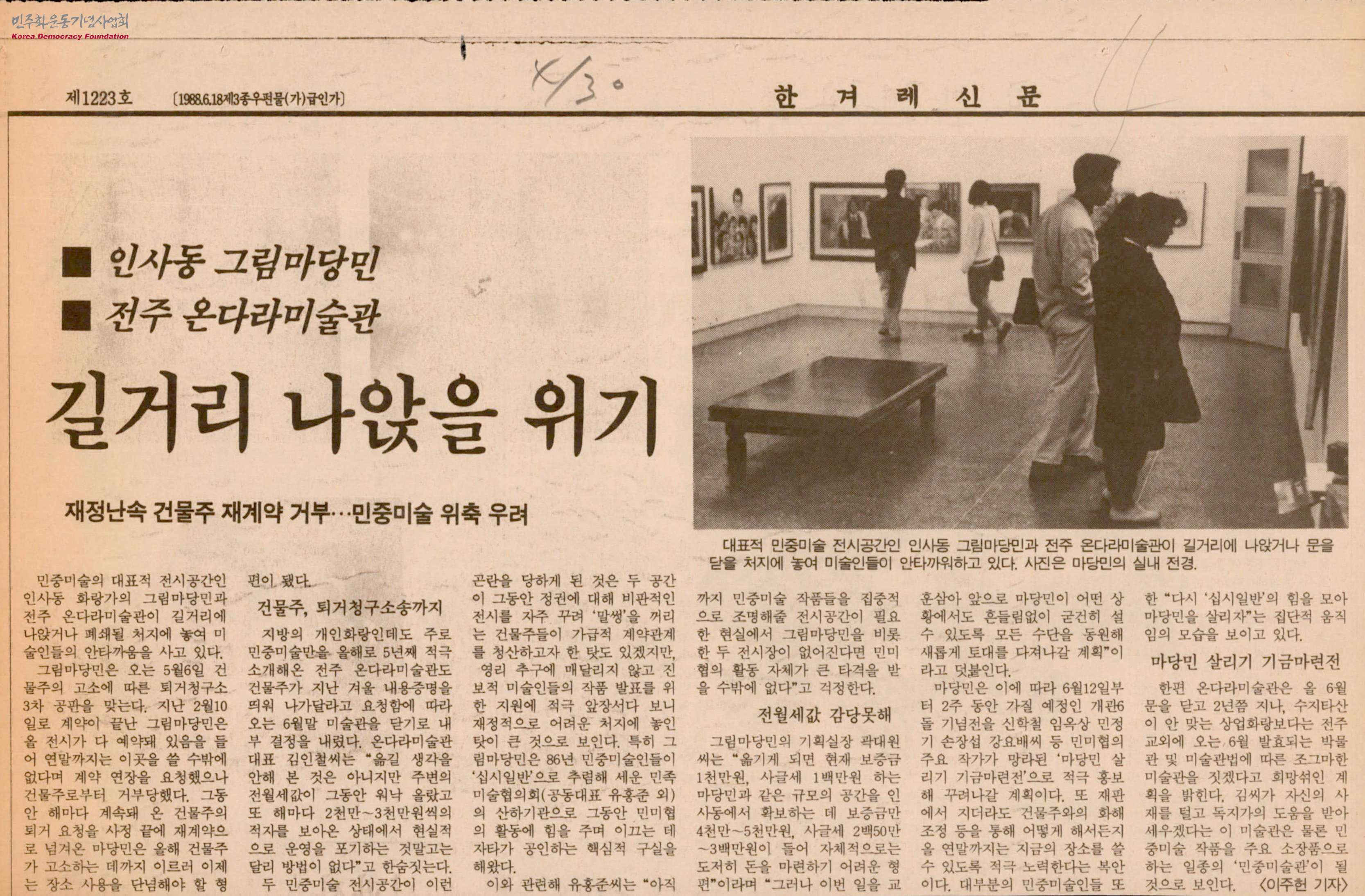 - 그림마당 민은 1992년 2월 10일로 계약이 끝났으나 1992년 연말까지 이 장소를 쓸 수밖에 없다며 계약 연장을 요청하였지만, 건물주로부터 거부 및 고소까지 당하여 장소 사용을 단념할 수밖에 없는 처지가 되었으며, 온다라 미술관은 1992년 6월 즈음 문을 닫고 수지타산이 안 맞는 상업화랑보다는 전주 교외에 박물관 및 미술관을 짓겠다는 입장을 밝혔다는 내용 등이 담긴 신문스크랩