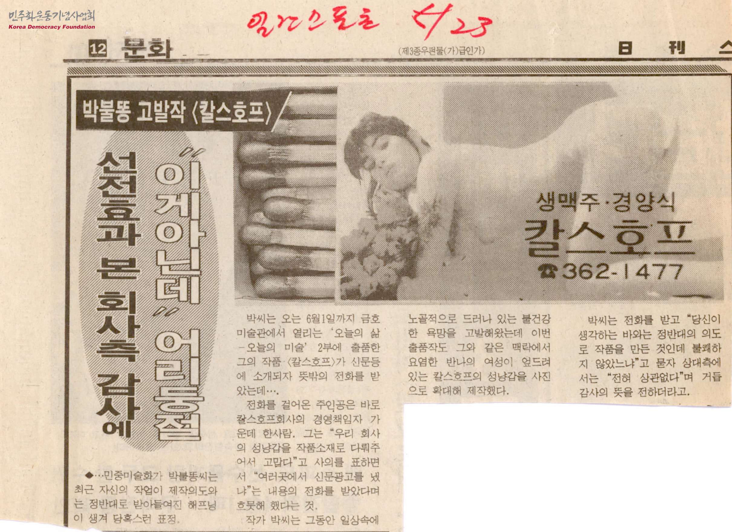- 민중미술화가 박불똥씨는 1992년 6월 1일까지 금호 미술관에서 열리는 '오늘의 삶-오늘의 미술' 2부에 출품한 작품 '칼스호프'를 신문 등으로 소개하였는데, 일상 속에서 노골적으로 드러나는 불건전한 욕망을 표현하고자 한 이 작품이 오히려 해당 사의 물품을 광고하는 모양이 되었으며, 실제로 해당 사로부터 감사 인사를 받아 당혹스러웠다는 내용의 신문스크랩