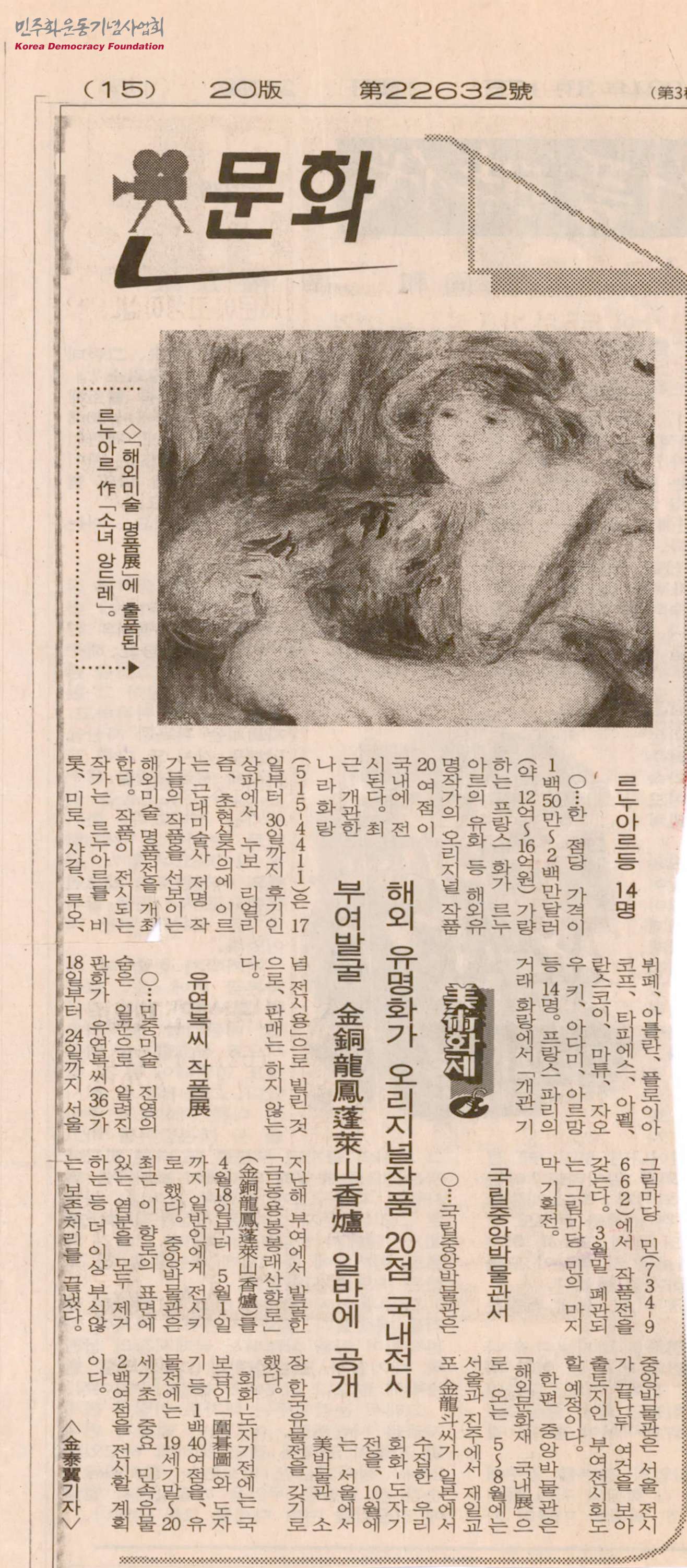 - 프랑스 화가 르누아르의 유화 등 해외 유명작가의 작품 20여 점이 나라화랑에서 전시된다는 내용, 민중미술 진영의 류연복 작가가 그림마당 민에서 작품전을 갖는다는 내용, 국립중앙박물관은 부여에서 발굴한 '금동용황봉래산향로'를 일반에 전시하기로 했다는 내용 등이 담긴 신문스크랩