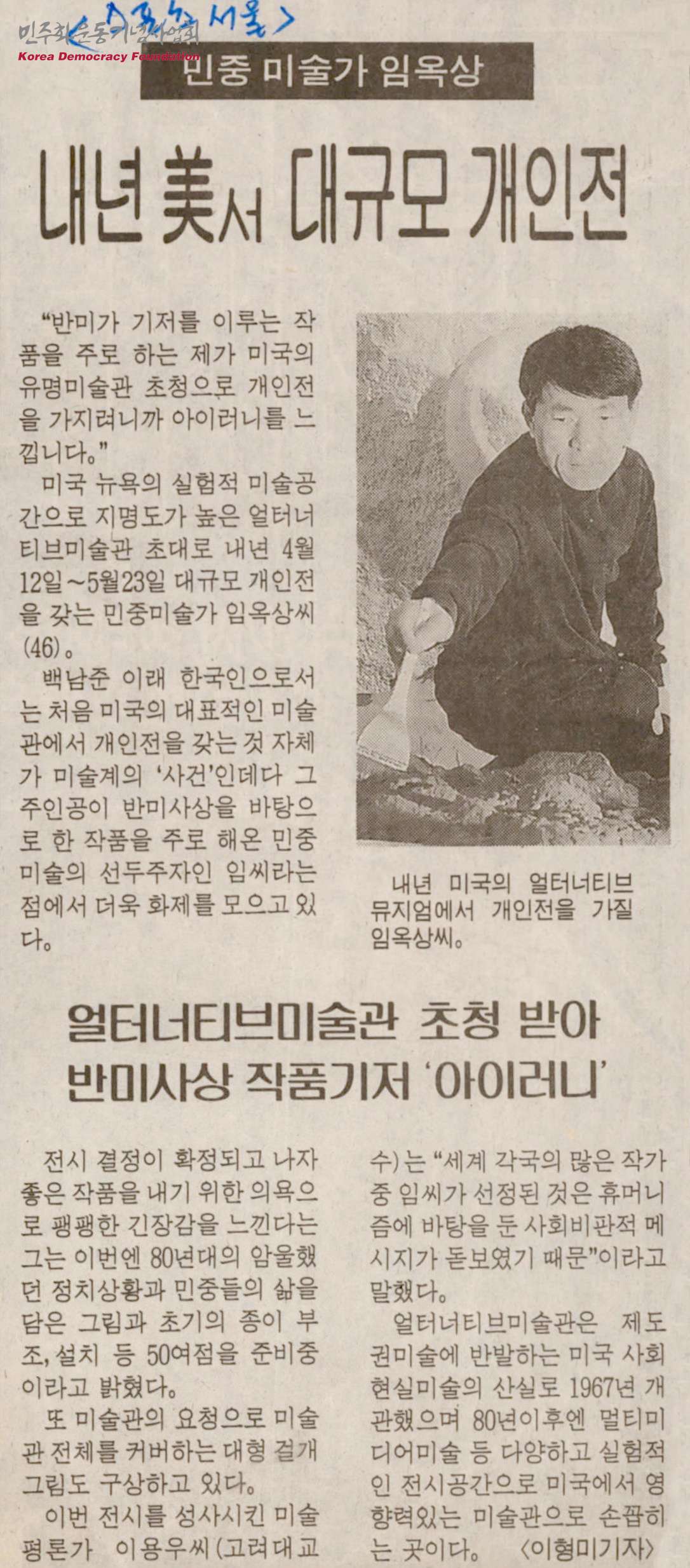 - 임옥상 작가는 얼터너티브미술관의 초대로 1997년 4월 12일부터 5월 23일까지 대규모 개인전을 갖게 되었는데, 이 초대전은 백남준 이래 한국인으로서는 처음 미국의 대표적인 미술관에서 개인전을 갖는 것이며, 그 작가가 주로 반미사상을 바탕으로 작품활동을 이어온 임옥상 작가라는 것에 많은 관심이 모이고 있다는 내용의 신문스크랩