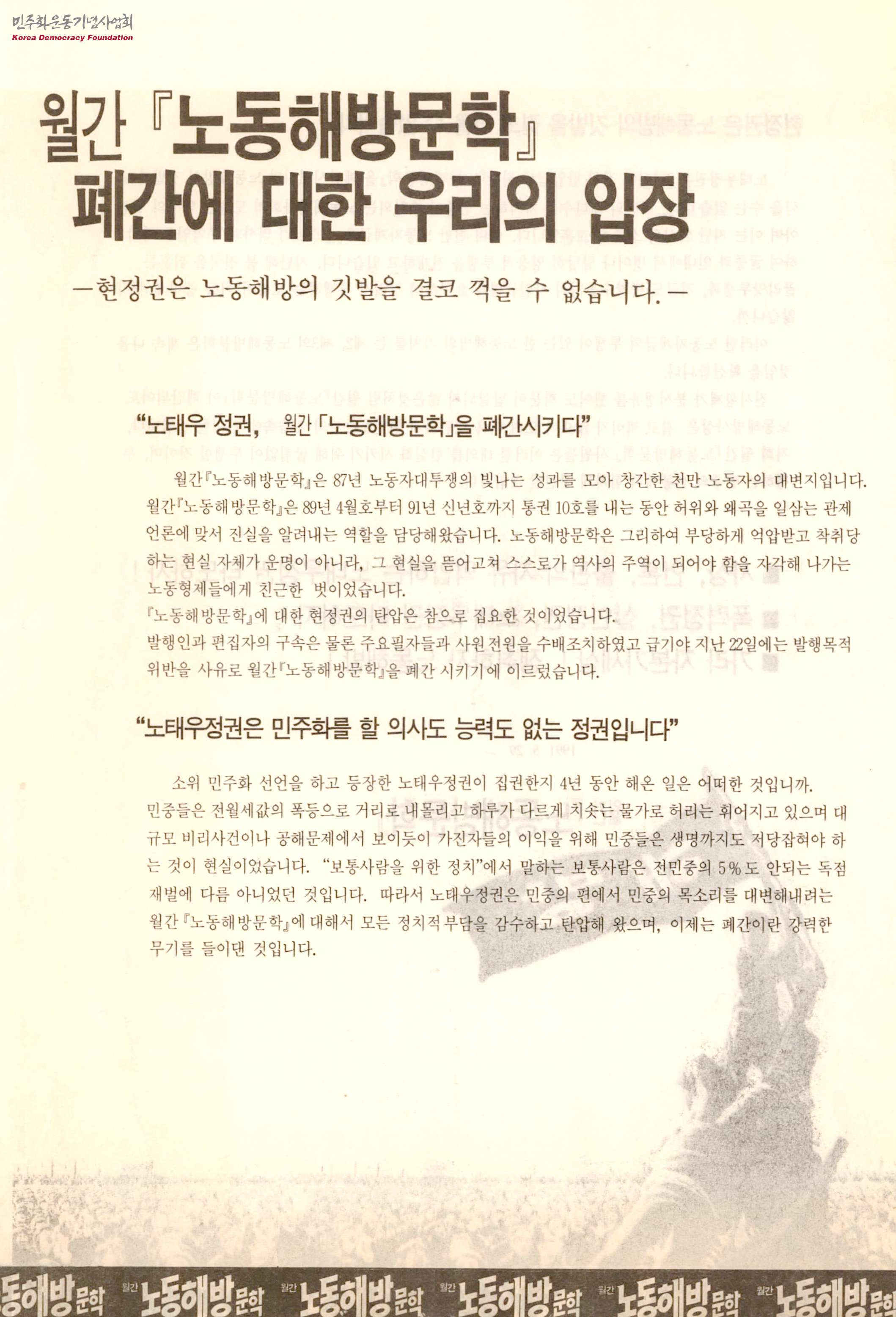 - 월간 '노동해방문학'은 1989년 노동자대투쟁의 성과를 모아 창간한 노동자 대변지 역할을 하였는데, 노태우 정권은 이 월간지의 발행인과 편집자를 구속하고 주요 필자들과 사원 전원을 수배조치 하였음. 이후 해당 월간지를 발행목적위반 사유로 폐간하였는데, 이는 노동자의 인권을 명백히 탄압한 것이기에 노태우 정권을 타도하자는 내용 등이 담겨 있는 글