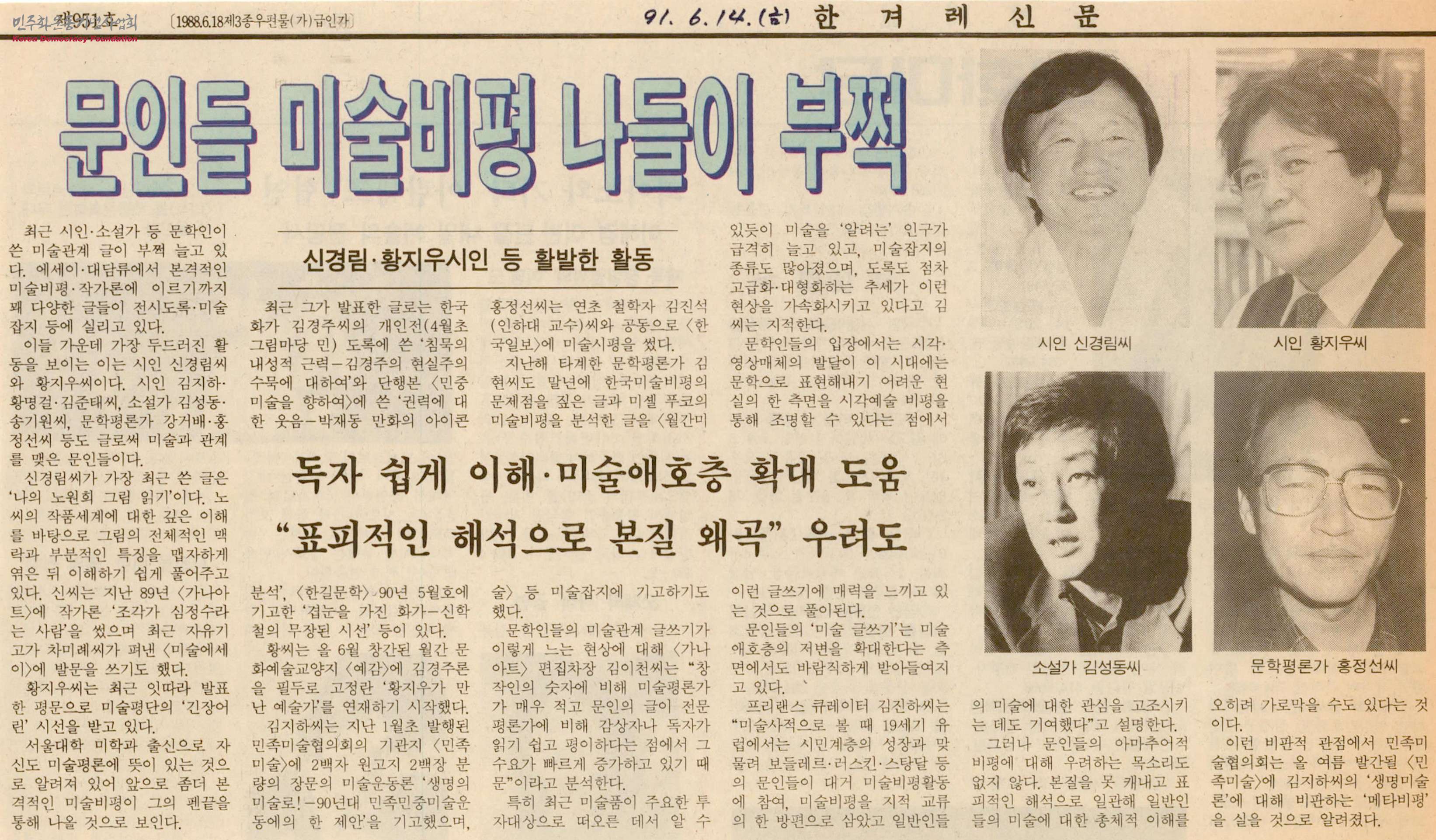 - 신경림, 황지우, 김성동, 홍정선 등 문학인이 쓴 미술관련 에세이, 본격적인 미술비평, 작가론 등 문인들의 비술 비평 글이 다양한 매체에 실리고 있다는 내용의 신문스크랩