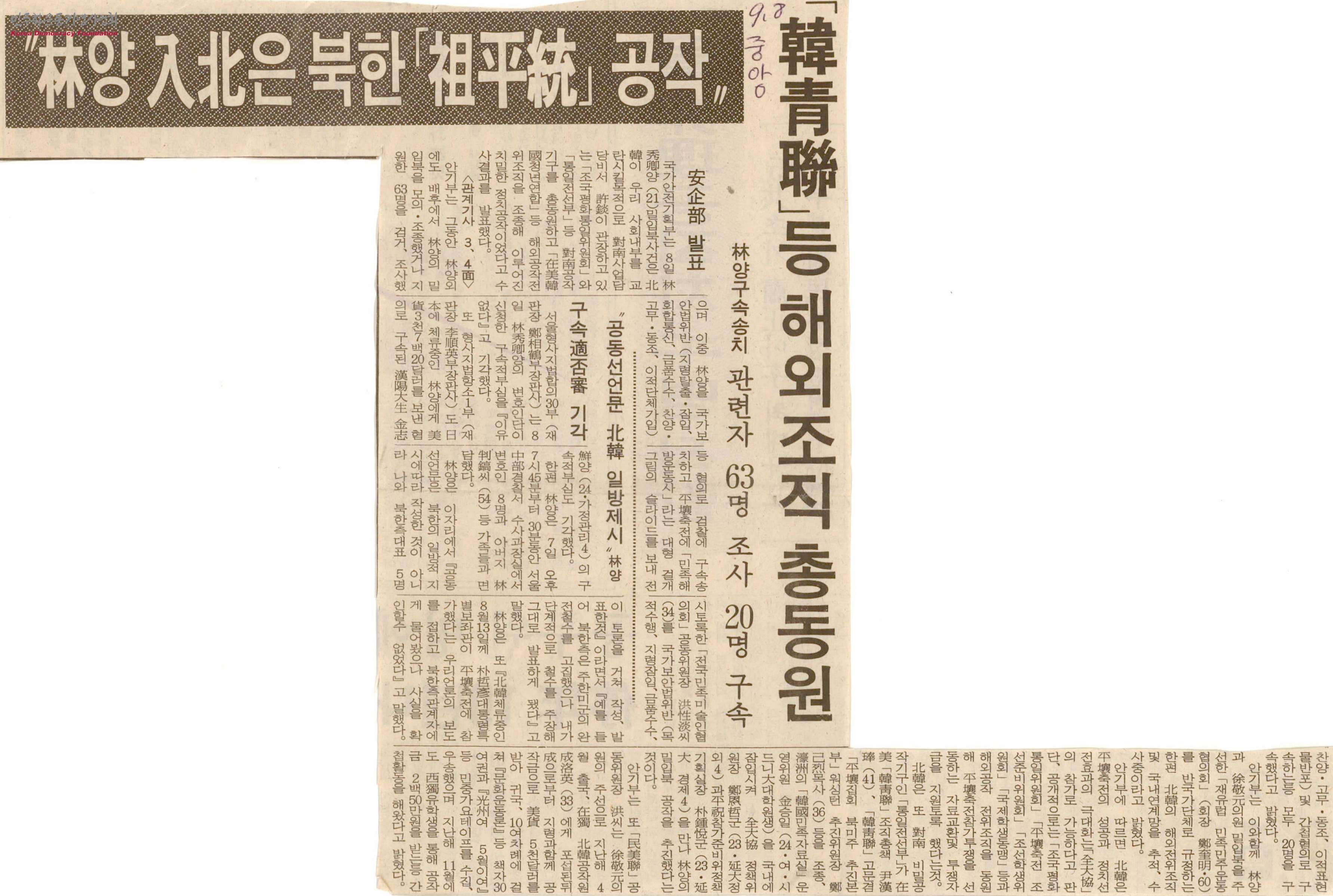 [신문스크랩]「韓靑聯(한청련)」 등 해외조직 총동원-林양 구속송치 관련자 63명 조사 20명 구속