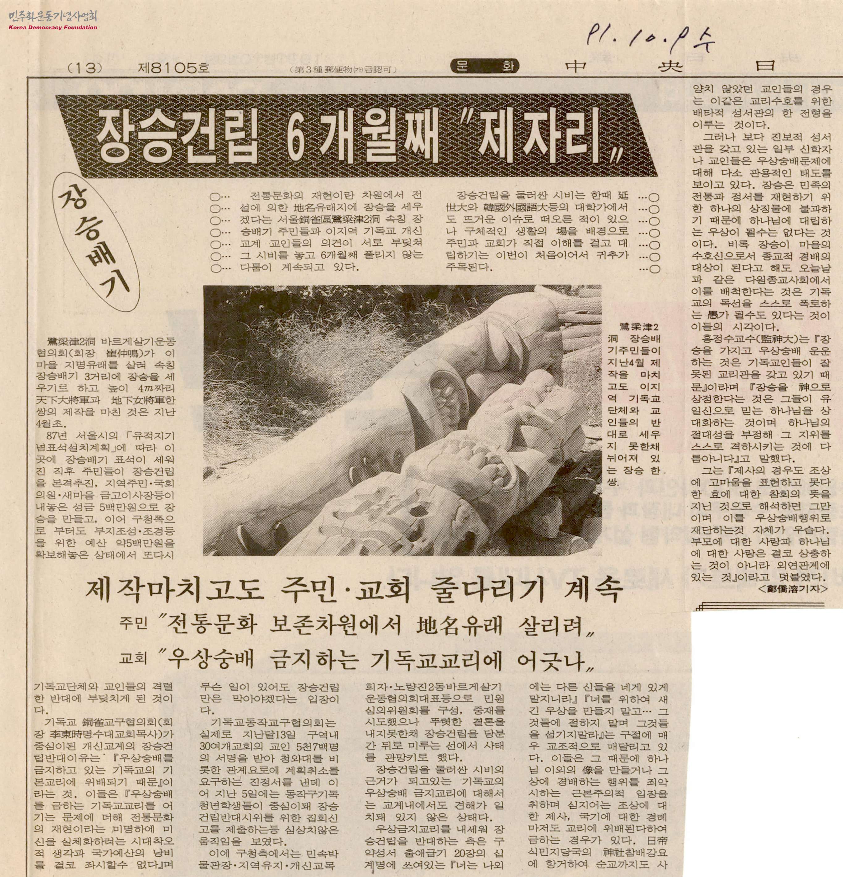 - 87년 서울시의 「유적지기념표석설치계획」에 따라 이곳에 장승배기 표석이 세워진 직후 주민들이 장승건립을 본격 추진하고 있으나 기독교단체와 교인들의 격렬한 우상숭배 반대에 맞서 갈등이 있다는 내용의 신문스크랩
