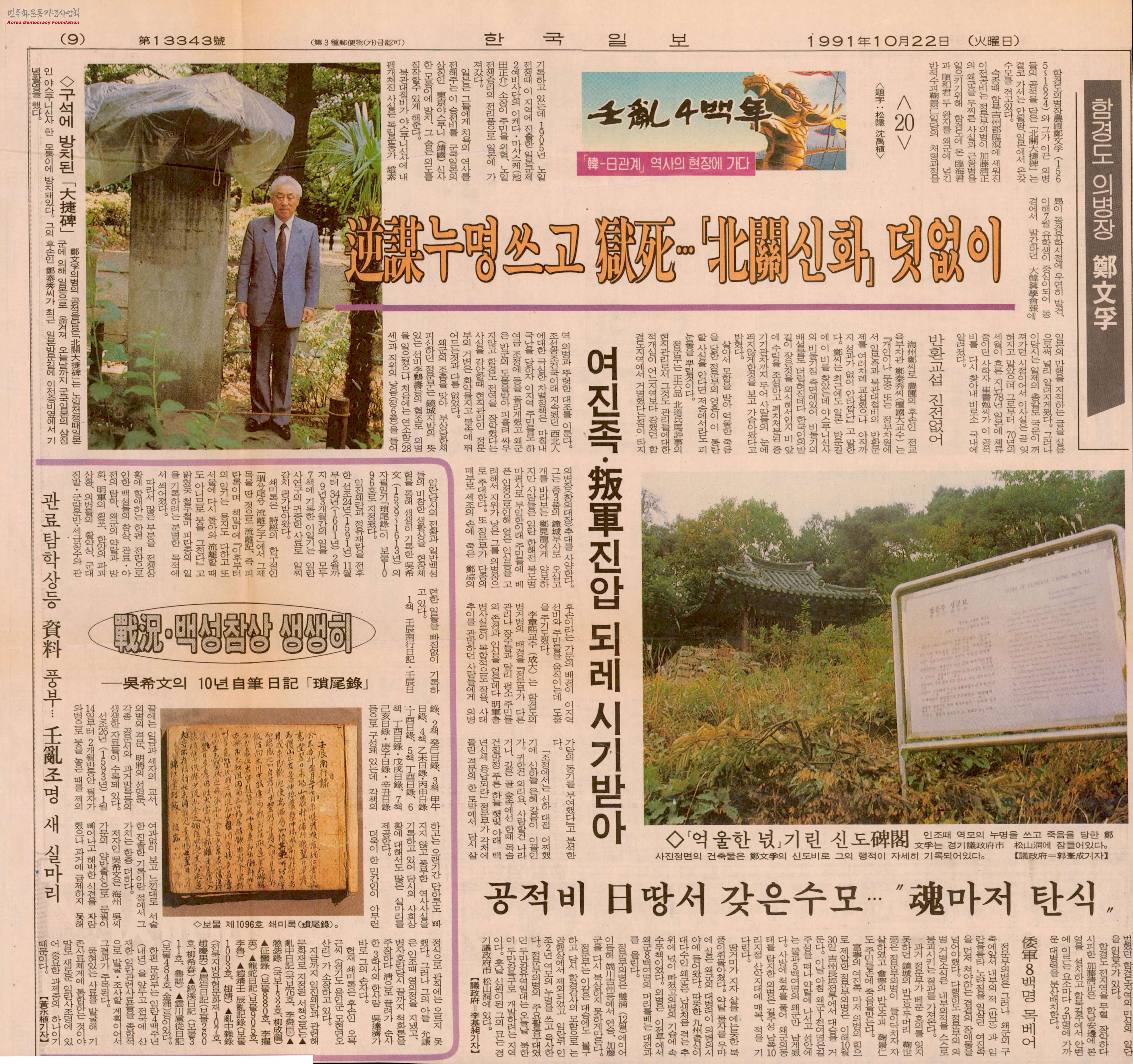 - 함경도의병장 농포 정문부와 의병들의 공적을 담은 「북관대첩비」가 일본에서 수모를 겪고 있다는 내용의 기사로 숙종대에 함경북도에 세워진 전공비는 1905년 함경북도에 진출한 일본군들에 의해 일본에 반출된 전공비에 대한 현황을 담고있는 신문스크랩