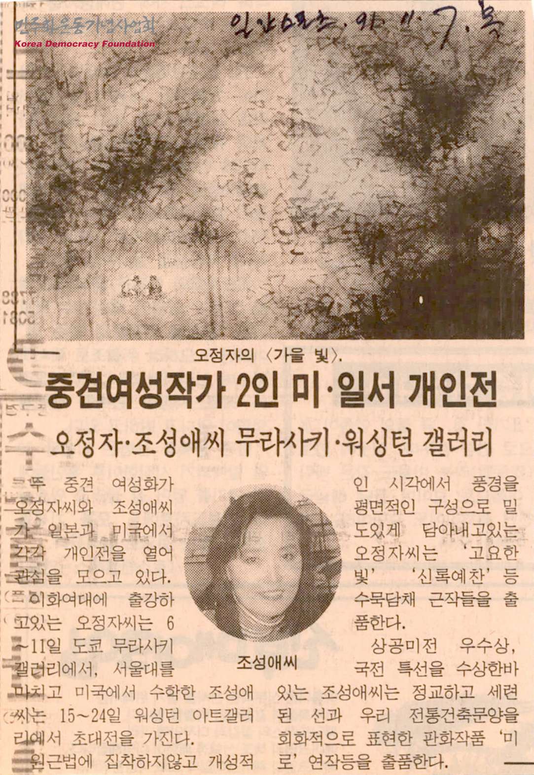 [신문스크랩]중견여성작가 2인 미·일서 개인전-오정자·조성애씨 무라사키·워싱턴 갤러리
