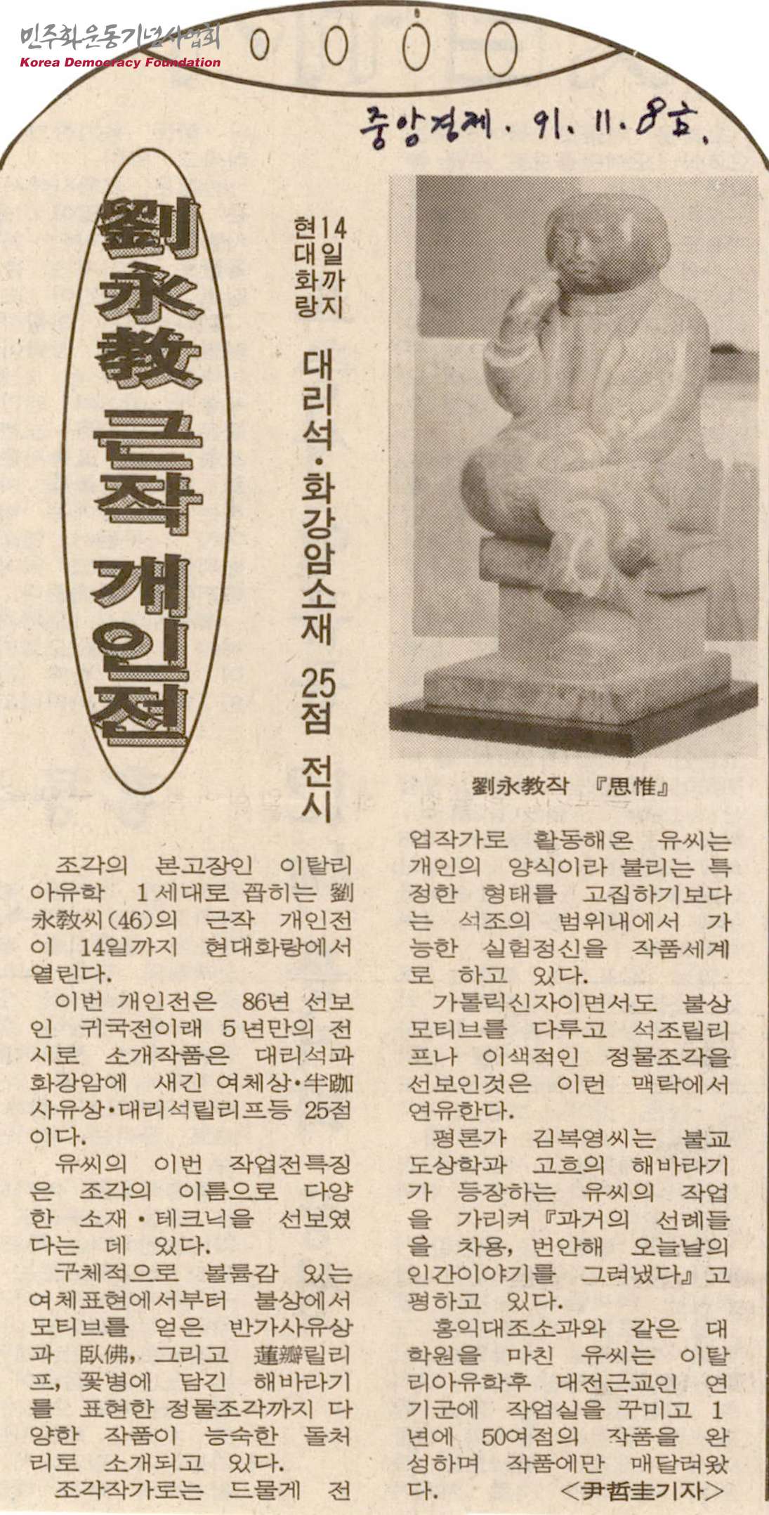 - 이탈리아유학 1세대로 꼽히는 유영교의 근작 개인전이 11월 14일까지 현대화랑에서 열리며 전시작품들은 대리석과 화강암에 새긴 여체상, 반가사유상, 대리석릴리프 등 25점으로 구성되었다는 내용의 신문스크랩